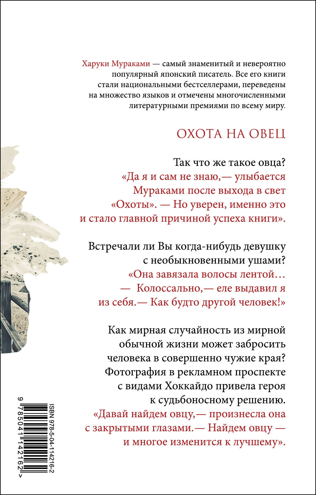 «О ее смерти мне сообщил по телефону старый приятель…» Так начинается «Охота на Овец» - пожалуй, самое странное путешествие по закоулкам современного мира и человеческого сознания, придуманное легендой современной литературы японским писателем Харуки Мураками. Этот роман стал абсолютным мировым бестселлером: «охота на овец» в наших душах не закончится никогда! Итак, позвоните в полицию, спросите адрес и номер телефона семьи, затем позвоните семье и узнайте дату и время похорон. А после, в назначенный день, садитесь в пригородную электричку от станции Васэда. И надейтесь, что охота будет удачной… Так что же такое овца? - Да я и сам не знаю, - улыбается Мураками после выхода в свет «Охоты». - Но уверен, именно это и стало главной причиной успеха книги. Как мирная случайность из спокойной обычной жизни может забросить человека в совершенно чужие края? Фотография в рекламном проспекте с видами Хоккайдо привела героя к судьбоносному решению. «Давай найдем овцу, - произнесла она с закрытыми глазами. - Найдем овцу - и многое изменится к лучшему».| Издательство | ООО "Издательство "Эксмо" |