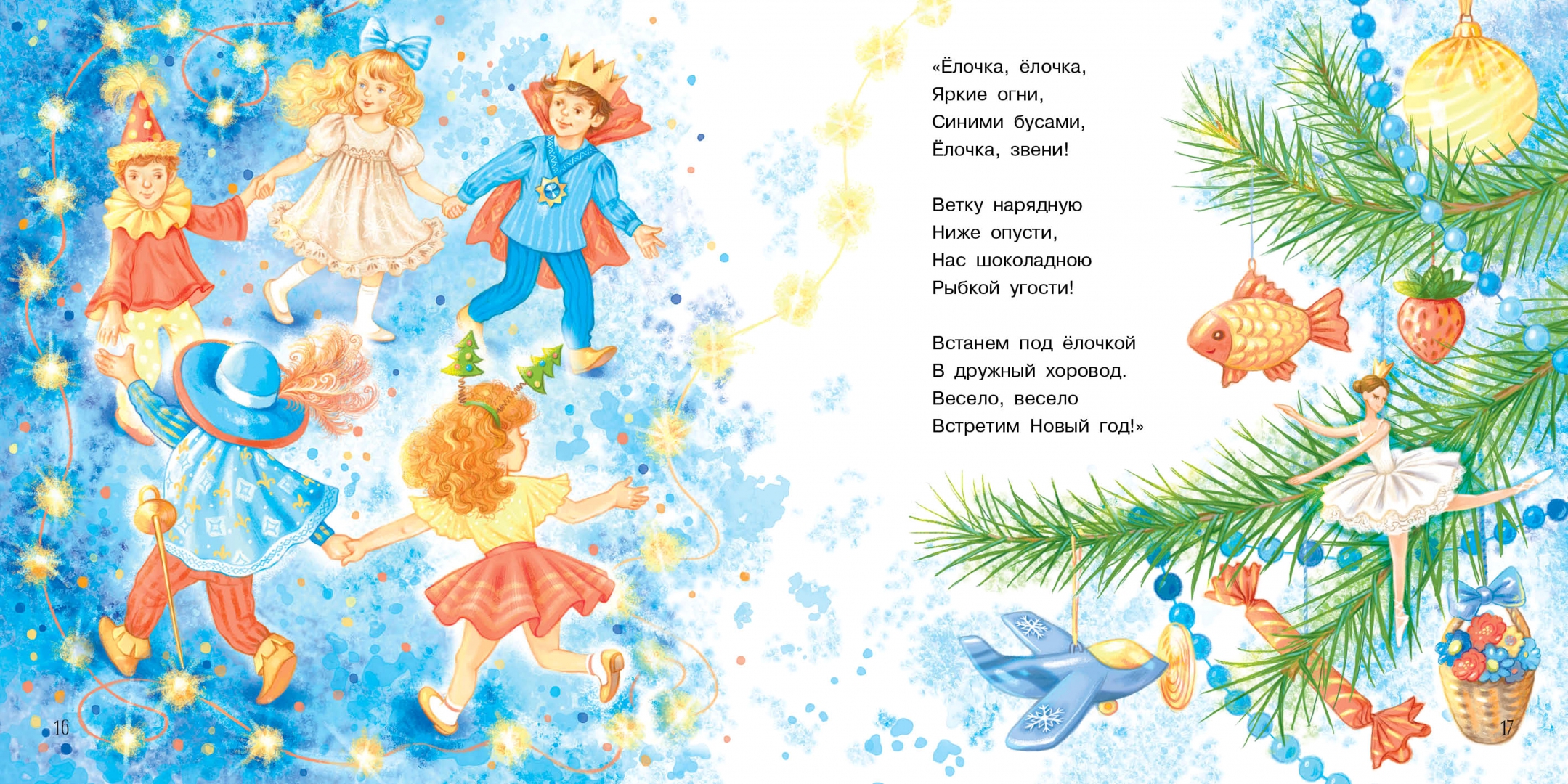 Иллюстрации Татьяны Сытой очень точно передают атмосферу самого главного и самого любимого праздника и взрослых, и детей. Гирлянды и хлопушки, разноцветные шары и снежинки. И конечно же веселый детский хоровод!