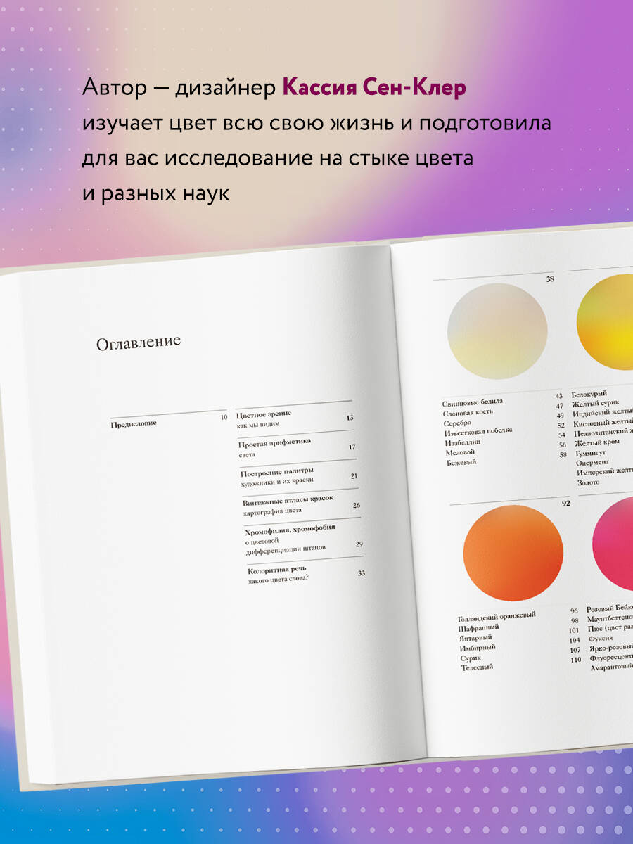 В XXI веке с наступлением эры визуальной информации мы хотим знать о цвете как можно больше. Откуда взялся тот или иной оттенок? Как устроены цветовые "семьи"? Какие драматические и комические истории связаны с тем или иным оттенком? Английская журналистка Кассия Сен-Клер, изучающая цвет всю свою жизнь, провела целое расследование и предлагает вам окунуться в удивительный и непредсказуемый мир цвета.
