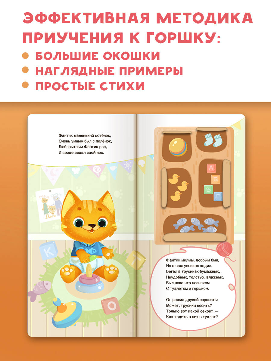 Вашему малышу уже полтора года? Пора учиться ходить на горшок! И - прощай, подгузник! Благодаря регулярному чтению и рассматриванию этой книги вместе с малышом, вы поможете ему быстро освоить этот важный навык. Психомоторика детей к 18 месяцам полностью сформирована для начала обучения самообслуживанию. В этом же возрасте активно развивается навык подражания взрослым и ровесникам. Глядя на котёнка Фантика и его друзей, ребёнок начнёт садиться на горшок сам "за компанию". История котёнка, научившегося ходить на горшок подана в весёлых стихах - именно стихотворная речь с рифмами и рефренами лучше запоминается малышами. А повторяющееся в стихах правило "взрослый ходит на горшок!" превратится в семейную призказку и мотивирует крошку расстаться с подгузником. Интерактивная книжка создана с учётом возрастных особенностей деток от 1,5 до 3 лет. Это обучающее издание интересно, удобно и понятно малышу. - Большие легко раскрывающиеся окошки для маленьких пальчиков - Стихи с запоминающимися рефренами в лучших традициях классики для малышей замечательного детского поэта Наталии Волковой - Необычный игровой формат - книгу легко держать и раскрывать - Книга создана с учётом психофизических особенностей малышей 1,5-3 лет. - Очаровательные забавные зверята понравятся ребёнку и научат его ходить на горшок| Издательство | ИЗДАТЕЛЬСТВО "АСТ" |
