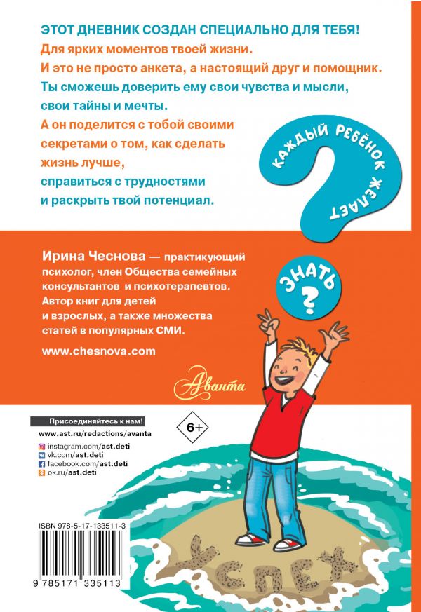 Это не просто дневник, а настоящий психологический тренинг для детей и подростков. На его страницах ребёнок сможет поделиться своими чувствами, мыслями, мечтами. Заполняя его, он лучше поймёт себя и других, а также узнает много интересного и полезного. Как верить в себя и справляться с неудачами. Что такое уважение и ответственность. Как победить страхи и развеять скуку. Как помочь себе, когда трудно, и позаботиться о своей безопасности. Как общаться свободно и уверенно и как раскрыть свой потенциал.