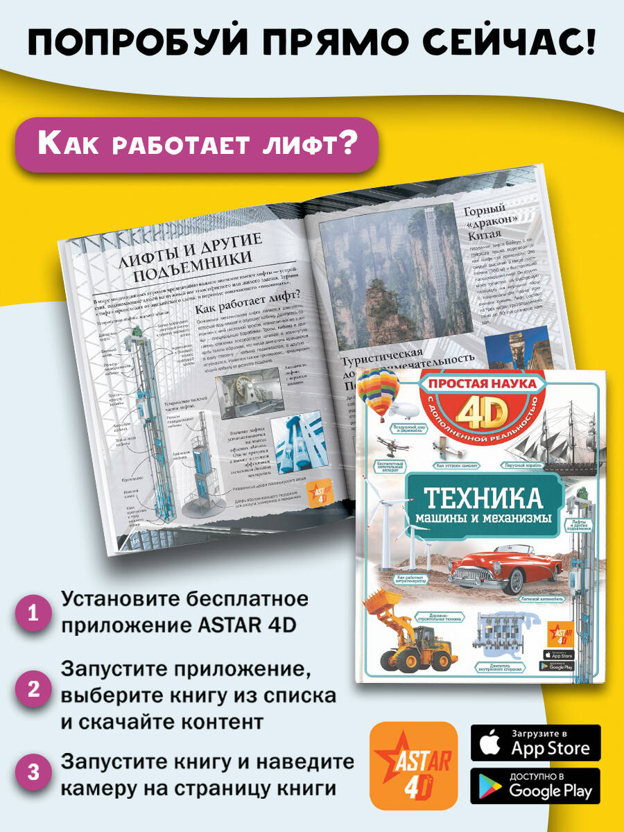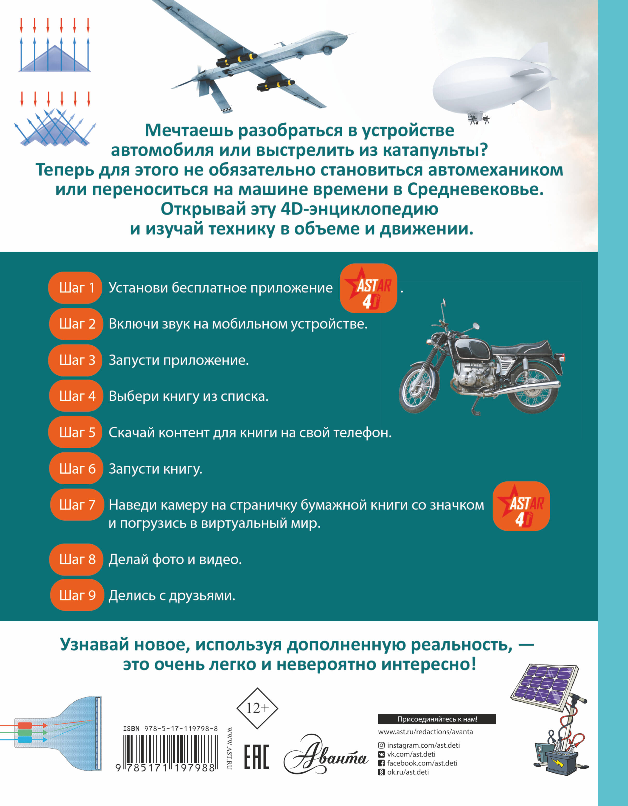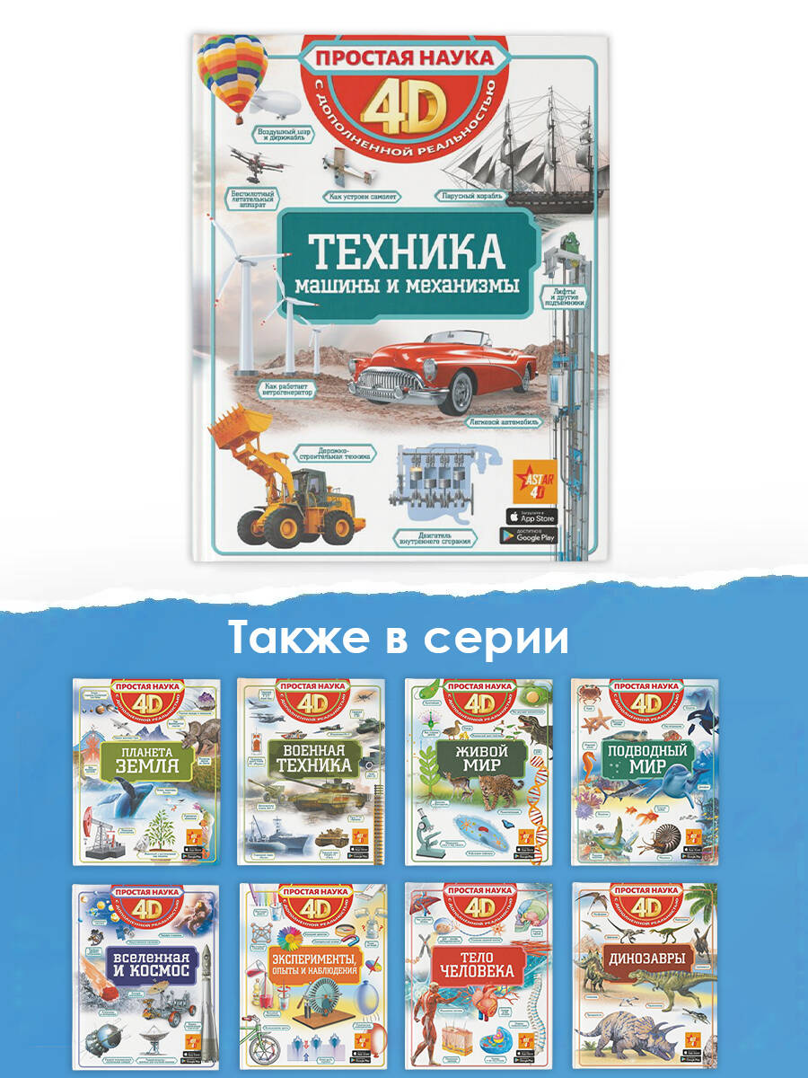 Эта книга рассказывает о различных машинах и механизмах, придуманных людьми за историю нашей цивилизации. За устройством и работой самых различных технических изобретений теперь можно наблюдать прямо на этих страницах, ведь это не обычная книга, а 4D-издание! Читай, изучай иллюстрации, рассматривай объемные движущиеся модели, слушай познавательные аудиозаписи. Элементы дополненной реальности обязательно помогу новым знаниям запомниться надолго. Изучать технику в 4D не только легко, но и невероятно интересно! Для среднего и старшего школьного возраста.| Издательство | ИЗДАТЕЛЬСТВО "АСТ" |