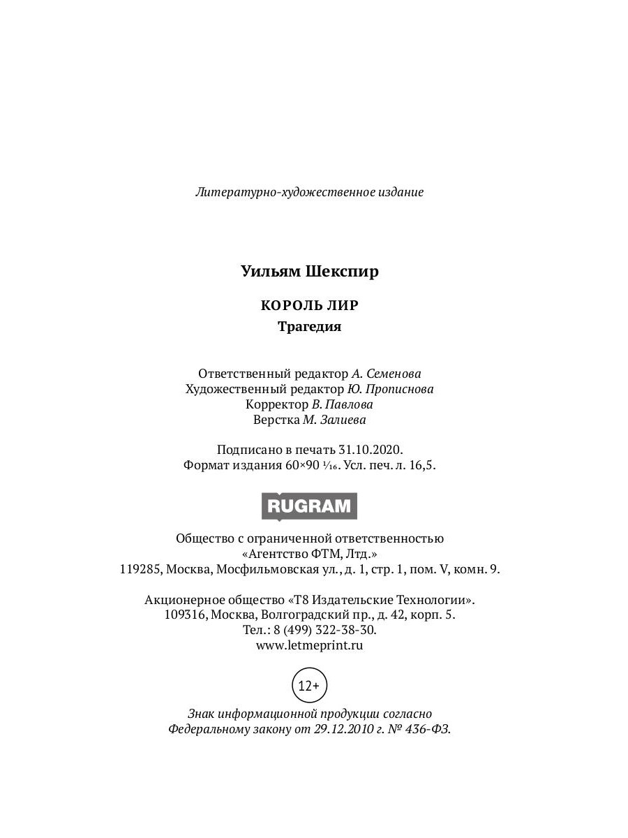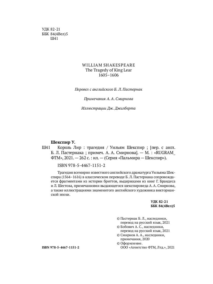 Трагедия всемирно известного английского драматурга Уильяма Шекспира (1564-1616) в классическом переводе Б.Л. Пастернака сопровождается фрагментами из истории бриттов, выдержками из книг Г. Брандеса и Л. Шестова, примечаниями выдающегося шекспироведа А.А. Смирнова, а также иллюстрациями знаменитого английского художника викторианской эпохи.