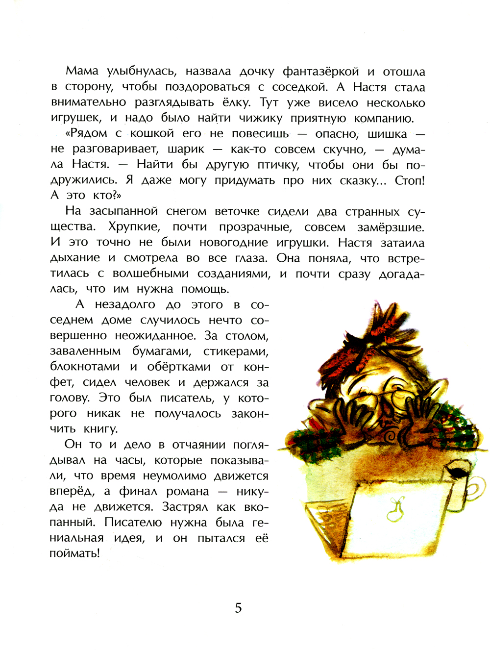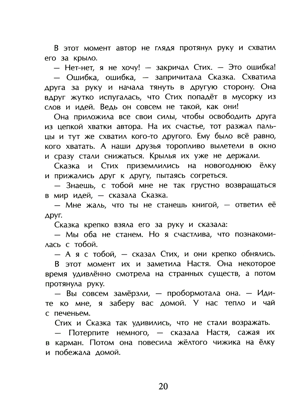 Сказка должна была превратиться в книгу с картинками и радовать детей. Но оказалось, что у писателя, который её придумал, очень много других дел: в очереди ждут детектив, фантастический роман и даже кулинарная книга. А если новогоднюю сказку не записать, ей придётся вернуться в мир идей и надолго затеряться там. Получится ли у сказки найти того, кто поможет ей стать настоящей книгой?| Издательство | Настя и Никита |