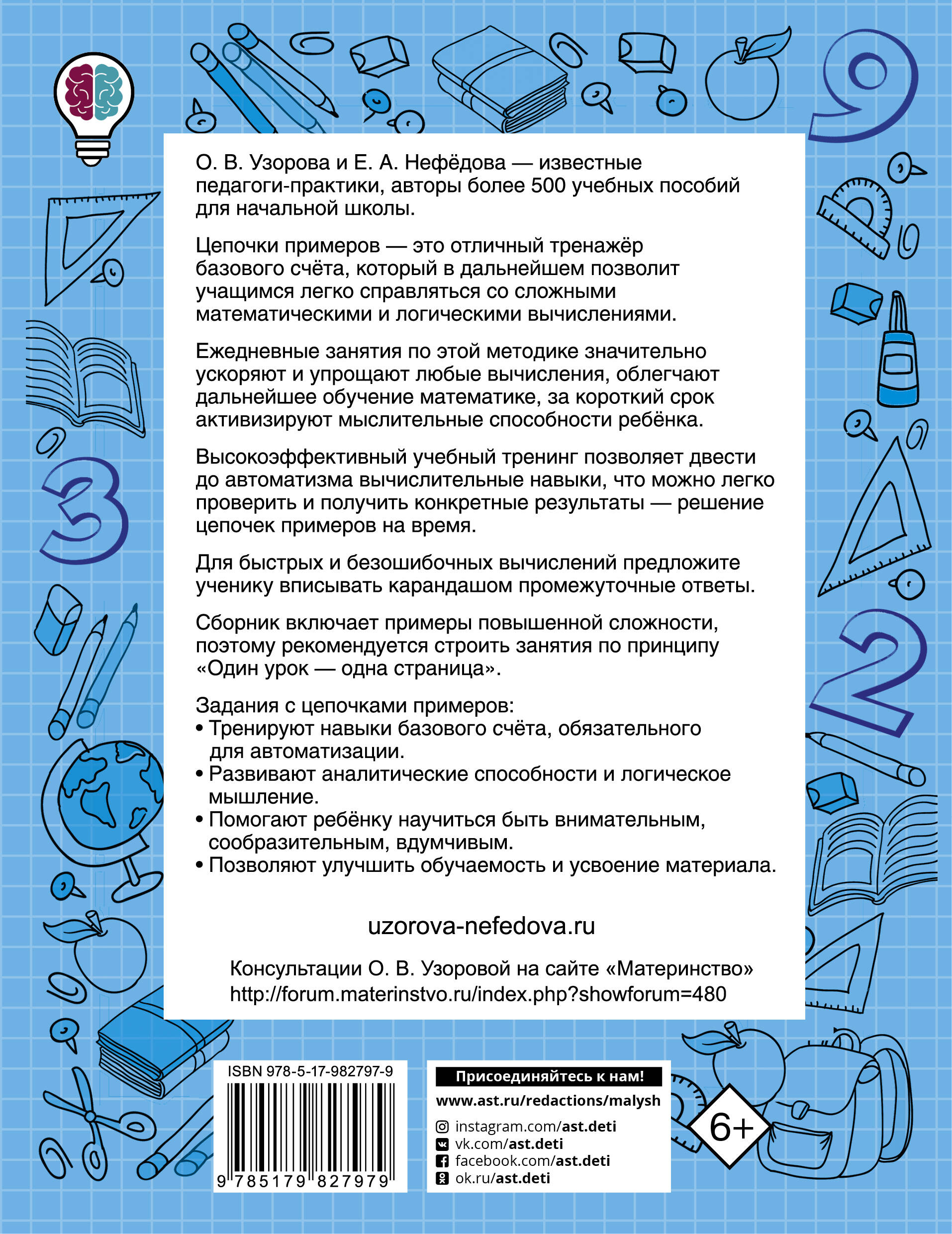 На страницах книги "Быстро считаем цепочки примеров. 4-й класс" вы найдёте подборку лучших упражнений для автоматизации навыков счета, разработанных известными педагогами О.В. Узоровой и Е.А. Нефёдовой. Регулярные занятия закрепляют правила выполнения математических действий, позволяют проверить знания и умения по курсу математики 4-го класса. Пособие можно использовать для работы дома и в классе по всем федеральным программам начальной школы.