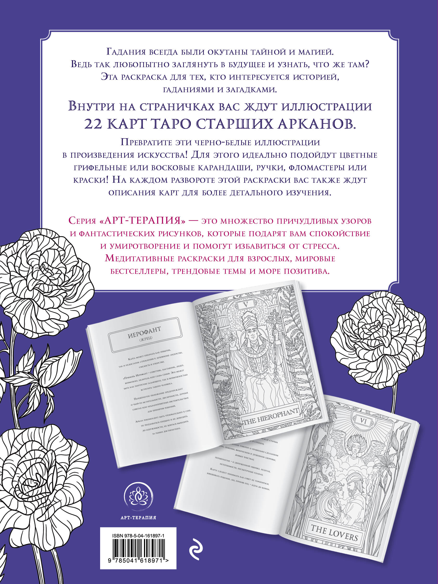 Существует несколько мистических легенд о появлении колоды ТАРО. В некоторых источниках указано, что колода была игральная еще в средневековой Европе, и только спустя какое-то время ее начали использовать для гадания. Какие-то источники утверждают, что колода пришла к нам со дна затонувшего города Атлантида, поэтому изображения на картах такие необычные и таинственные. Некоторые ученые предполагают, что родина колоды - Древний Египет. Где правда, а где ложь, не знает никто, но это и не важно! Если вы увлеченный и интересующийся человек, вам понравится эта раскраска! Немного магии, щепотка пророчества и авторская иллюстрация! Для раскраски взяты образы ТАРО Старших Арканов, описание каждой карты на обороте для более детального изучения. Страницы выполнены из плотной бумаги, поэтому вы можете использовать любые художественные инструменты, а большой формат раскраски поможет разглядеть мельчайшие детали. Это раскраска идеально подойдет тем, кто увлекается загадками, историей, может, даже мистикой и немножко гаданиями! Расслабьтесь после тяжелого рабочего дня с интересными иллюстрациями, возьмите в руки карандаши или фломастеры и подарите мистическим картам новые необычные цвета!| Издательство | Эксмо |