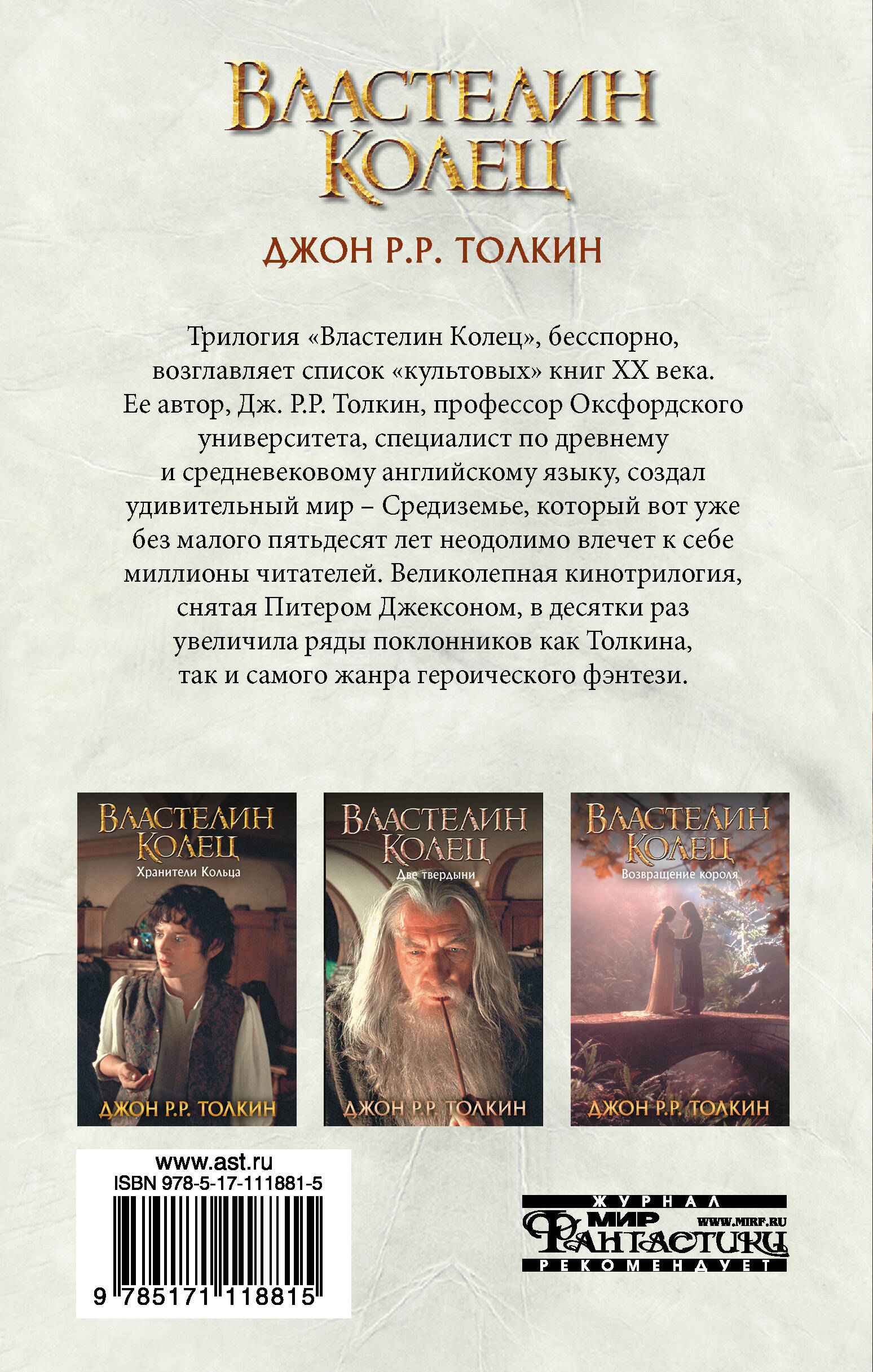 Трилогия "Властелин Колец" бесспорно возглавляет список "культовых" книг XX века. Ее автор, Дж. Р.Р. Толкин, профессор Оксфордского университета, специалист по древнему и средневековому английскому языку, создал удивительный мир - Средиземье, который вот уже без малого пятьдесят лет неодолимо влечет к себе миллионы читателей. Великолепная кинотрилогия, снятая Питером Джексоном, в десятки раз увеличила ряды поклонников как Толкина, так и самого жанра героического фэнтези.| Издательство | ИЗДАТЕЛЬСТВО "АСТ" |