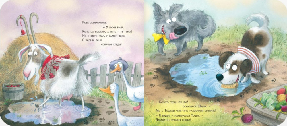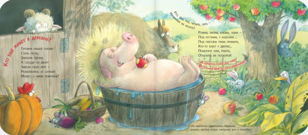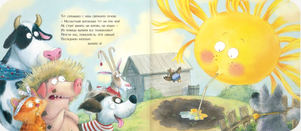 На ферме переполох: у тетушки свиньи пропала ее любимая… лужа! Кто ее мог выпить? Тетушка допросила всех соседей. Но никто из «подозреваемых» не сознается. А развязка оказалась совершенно неожиданной… Веселые стихи Натальи Карповой, озорные рисунки Любови Ерёминой-Ношин, да еще и загадочные картинки, где надо найти остальных обитателей фермы, развлекут и порадуют всех - малышей, их родителей, бабушек и дедушек. Книга напечатана на плотном картоне с фигурной вырубкой. Для чтения взрослыми детям.