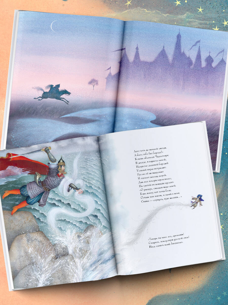 "Руслан и Людмила" - первая поэма А. С. Пушкина, которую он писал, вдохновляясь русскими былинами. Сказочный кот, который ходит по цепи вокруг дуба у Лукоморья, тридцать прекрасных витязей, выходящих из морских вод, колдун, укравший Людмилу, и Руслан, освободивший от колдовских чар свою возлюбленную, - известны каждому. С этой поэму к А. С. Пушкину пришла слава и всенародное признание. Чудесные иллюстрации Яны Седовой передают атмосферу настоящего русского эпоса и волшебства подлинной любви, которая побеждает во все времена.