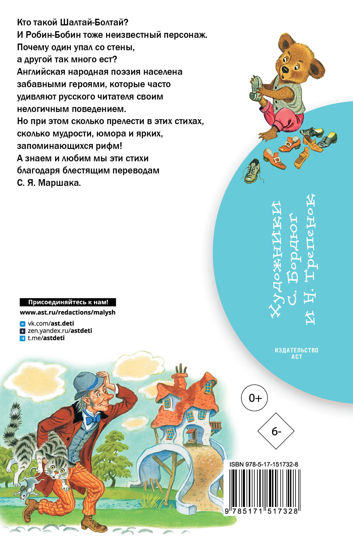 Кто такой Шалтай-Болтай? И Робин-Бобин тоже неизвестный персонаж. Почему один упал со стены, а другой так много ест? Английская народная поэзия населена забавными героями, которые часто удивляют русского читателя своим нелогичным поведением. Но при этом сколько прелести в этих стихах, сколько мудрости, юмора и ярких, запоминающихся рифм! А знаем и любим мы эти стихи благодаря блестящим переводам С. Я. Маршака.| Издательство | ИЗДАТЕЛЬСТВО "АСТ" |