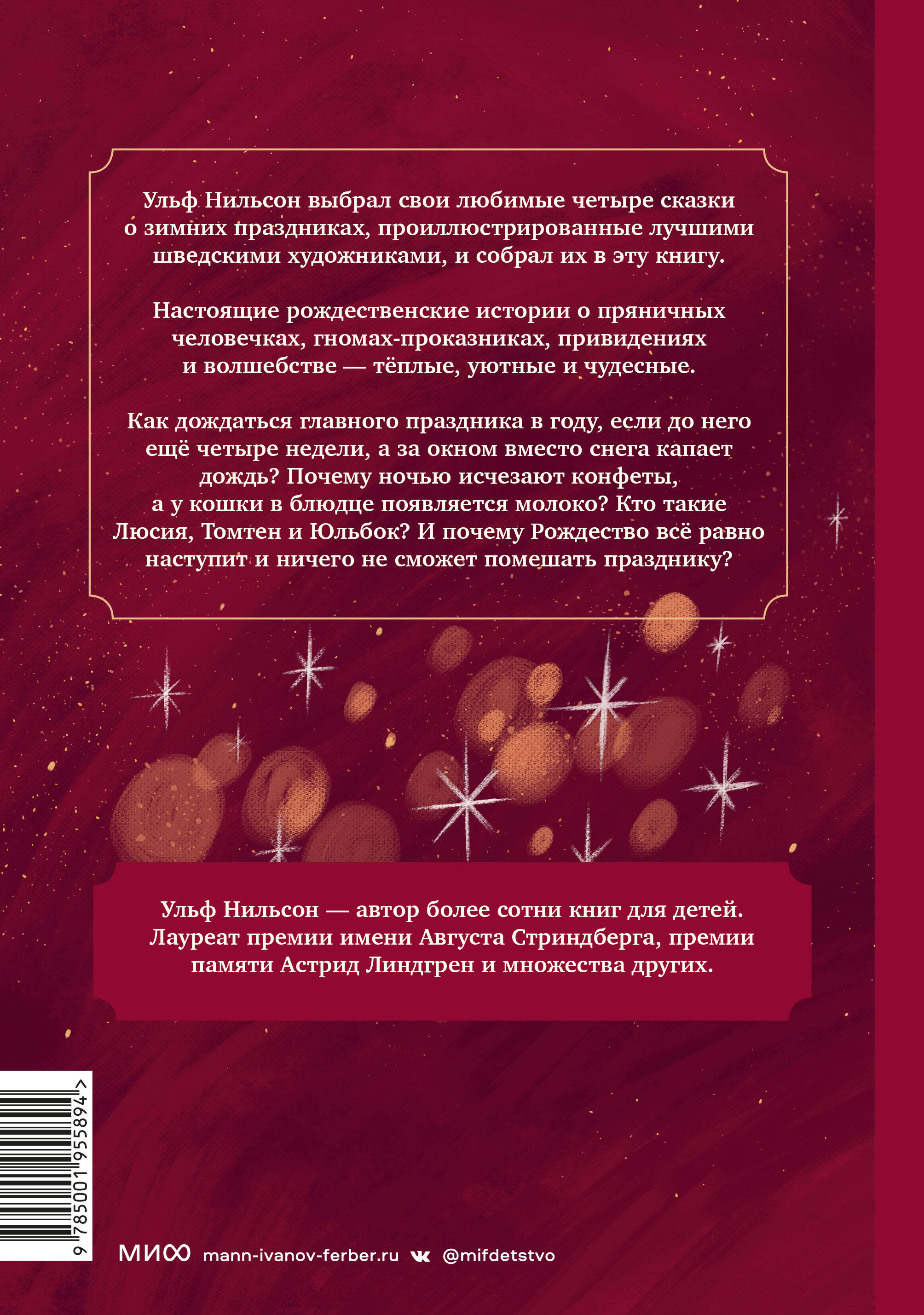 Ульф Нильсон - современный шведский сказочник - собрал в этой книге четыре истории о пряничных человечках, проказниках-гномах, елках и волшебстве, а проиллюстрировали их лучшие художники. Это невероятно тёплые, уютные и чудесные сказки. Читайте их по одной в каждую неделю декабря.
