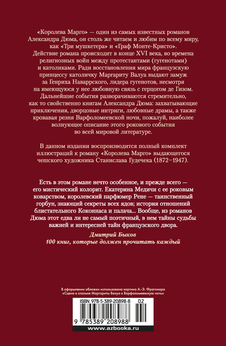 "Королева Марго" - один из самых известных романов Александра Дюма, он столь же читаем и любим по всему миру, как "Три мушкетера" и "Граф Монте-Кристо". Действие романа происходит в конце XVI века, во времена религиозных войн между протестантами (гугенотами) и католиками. Ради восстановления мира французскую принцессу, католичку Маргариту де Валуа женят на Генрихе Наваррском, лидере гугенотов, несмотря на имеющуюся у нее любовную связь с герцогом де Гизом. Дальнейшие события разворачиваются стремительно, как то свойственно книгам Александра Дюма: захватывающие приключения, дворцовые интриги, любовные драмы, а также кровавая резня Варфоломеевской ночи, пожалуй, наиболее волнующее описание этого рокового события во всей мировой литературе. В данном издании воспроизводится полный комплект иллюстраций к роману "Королева Марго" выдающегося чешского художника Станислава Гудечека (1872-1947).| Издательство | Азбука-Аттикус Издат.группа ООО |