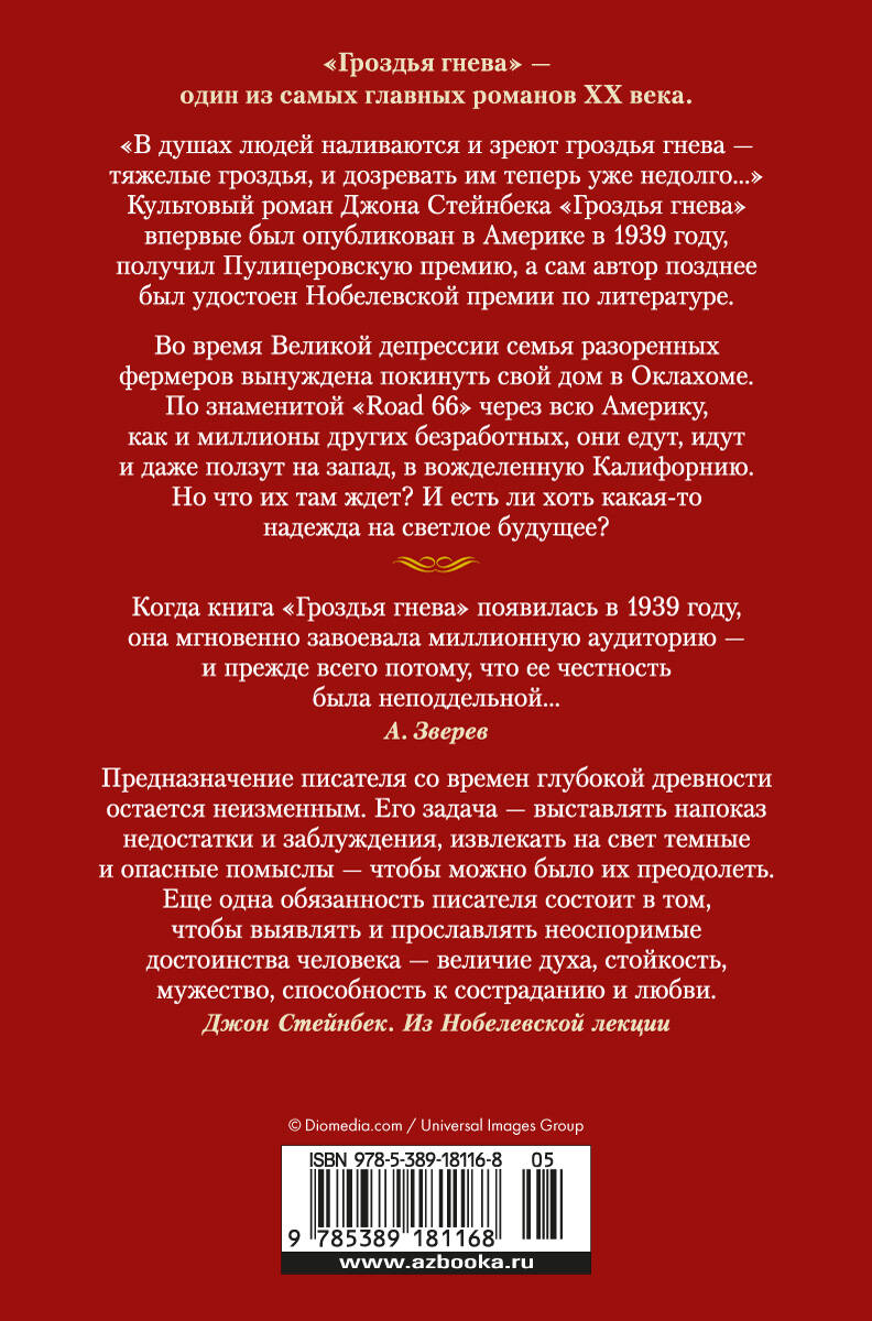 В душах людей наливаются и зреют гроздья гнева - тяжелые гроздья, и дозревать им теперь уже недолго... Культовый роман Джона Стейнбека "Гроздья гнева" впервые был опубликован в Америке в 1939 году, получил Пулицеровскую премию, а сам автор позднее был награжден Нобелевской премией по литературе. Во время Великой депрессии семья разоренных фермеров вынуждена покинуть свой дом в Оклахоме. По знаменитой "Road 66" через всю Америку, как и миллионы других безработных, они едут, идут и даже ползут на запад, в вожделенную Калифорнию. Но что их там ждет? И есть ли хоть какая-то надежда на светлое будущее?| Издательство | Азбука-Аттикус Издат.группа ООО |