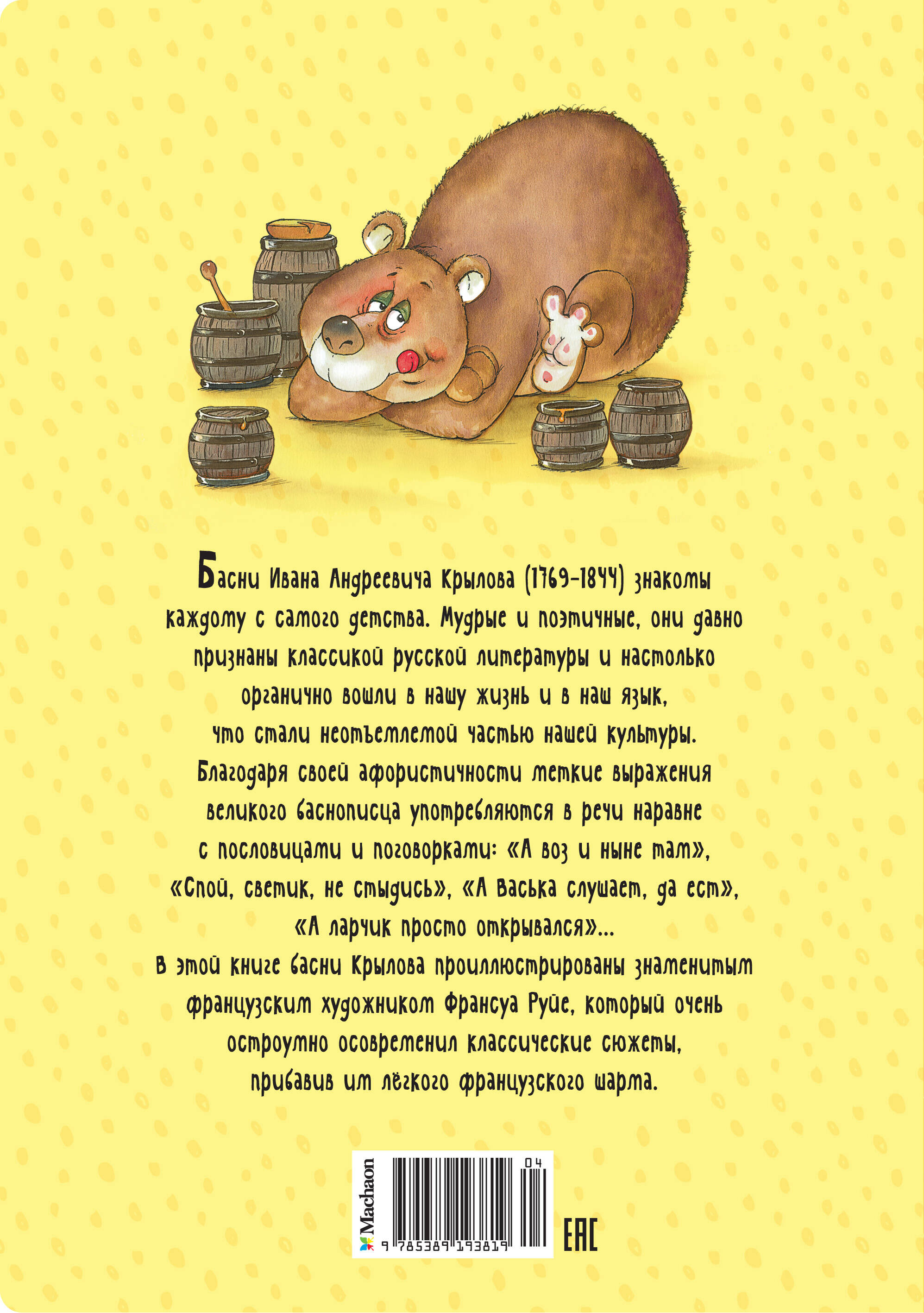 Басни Ивана Андреевича Крылова (1769-1844) знакомы каждому с самого детства. Мудрые и поэтичные, они давно признаны классикой русской литературы и настолько органично вошли в нашу жизнь и в наш язык, что стали неотъемлемой частью нашей культуры. Благодаря своей афористичности меткие выражения великого баснописца употребляются в речи наравне с пословицами и поговорками: "А воз и ныне там", "Спой, светик, не стыдись", "А Васька слушает, да ест", "А ларчик просто открывался"... В этой книге басни Крылова проиллюстрированы знаменитым французским художником Франсуа Руйе, который очень остроумно осовременил классические сюжеты, прибавив им лёгкого французского шарма.| Издательство | Азбука-Аттикус Издат.группа ООО |
