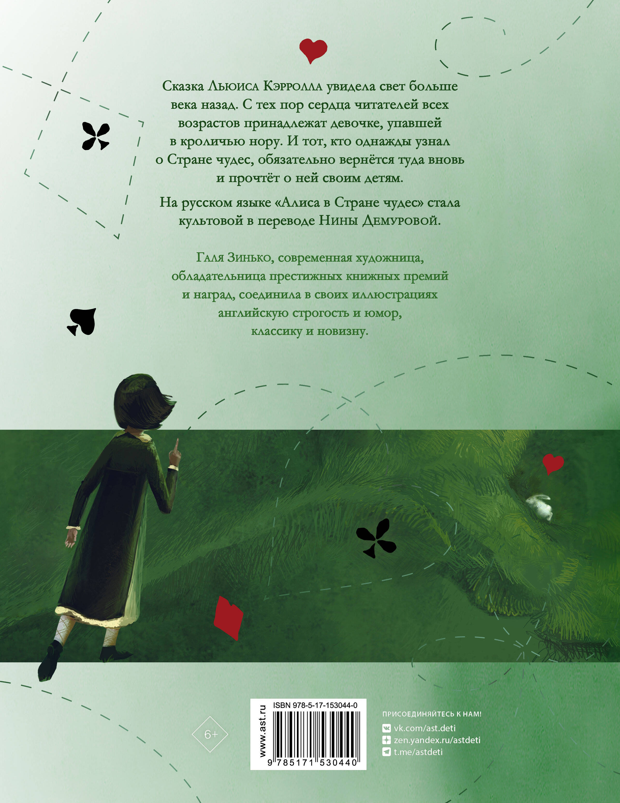 Сказка Льюиса Кэрролла увидела свет больше века назад. С тех пор сердца читателей всех возрастов принадлежат девочке, упавшей в кроличью нору. И тот, кто однажды узнал о Стране чудес, обязательно вернётся туда вновь и прочтёт о ней своим детям. На русском языке "Алиса в Стране чудес" стала культовой в переводе Нины Демуровой. Галя Зинько, современная художница, обладательница престижных книжных премий и наград, соединила в своих иллюстрациях английскую строгость и юмор, классику и новизну.| Издательство | ИЗДАТЕЛЬСТВО "АСТ" |