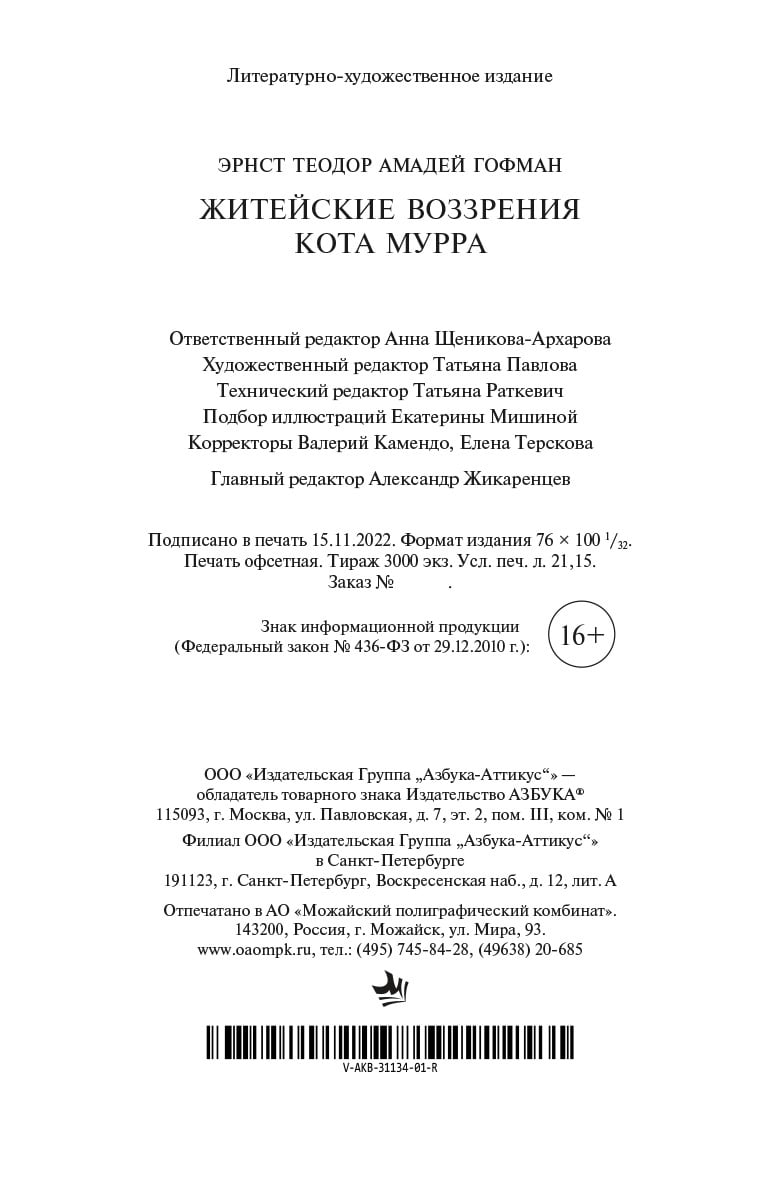 «Житейские воззрения кота Мурра» - последний роман великого немецкого писателя Э. Т. А. Гофмана, блистательный итог его творчества, соединившего реальность и фантазию, романтический порыв и едкую сатиру. Это удивительное произведение, которое сам Гофман считал лучшим из своих романов, представляет собой записки ученого кота, прагматика и эпикурейца Мурра, местами переложенные случайно попавшими в рукопись листами из биографии «безумного капельмейстера» Крейслера, энтузиаста-мечтателя, неисправимого романтика и alter ego самого Гофмана. По признанию автора, у Мурра был прототип: «Это кот дивной красоты и еще большего ума, которого я воспитал, он-то и дал мне повод к той забавной мистификации, которой пронизана эта, собственно говоря, серьезная весьма книга».| Издательство | Азбука |