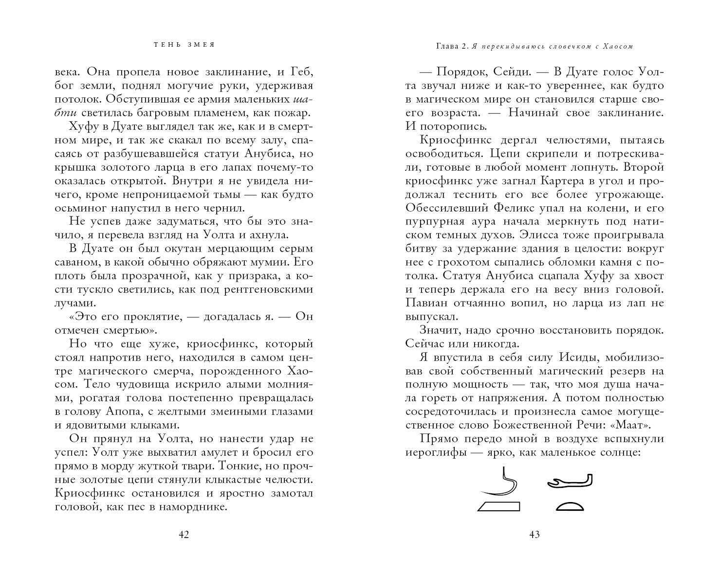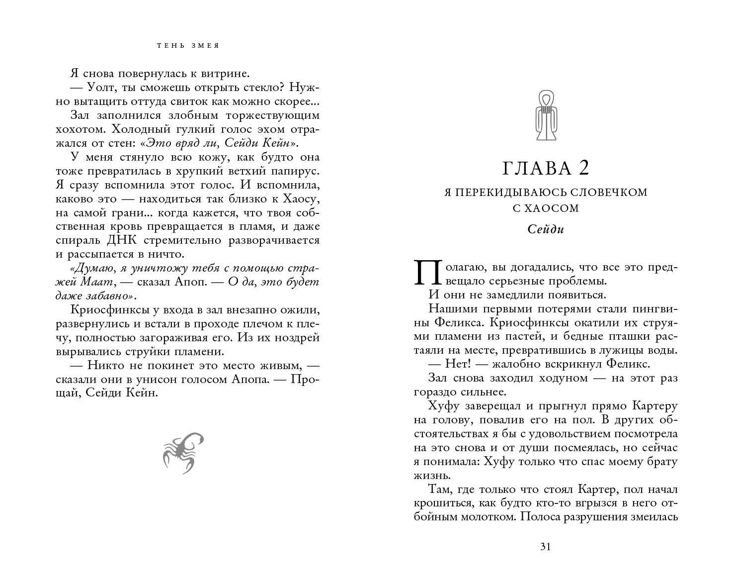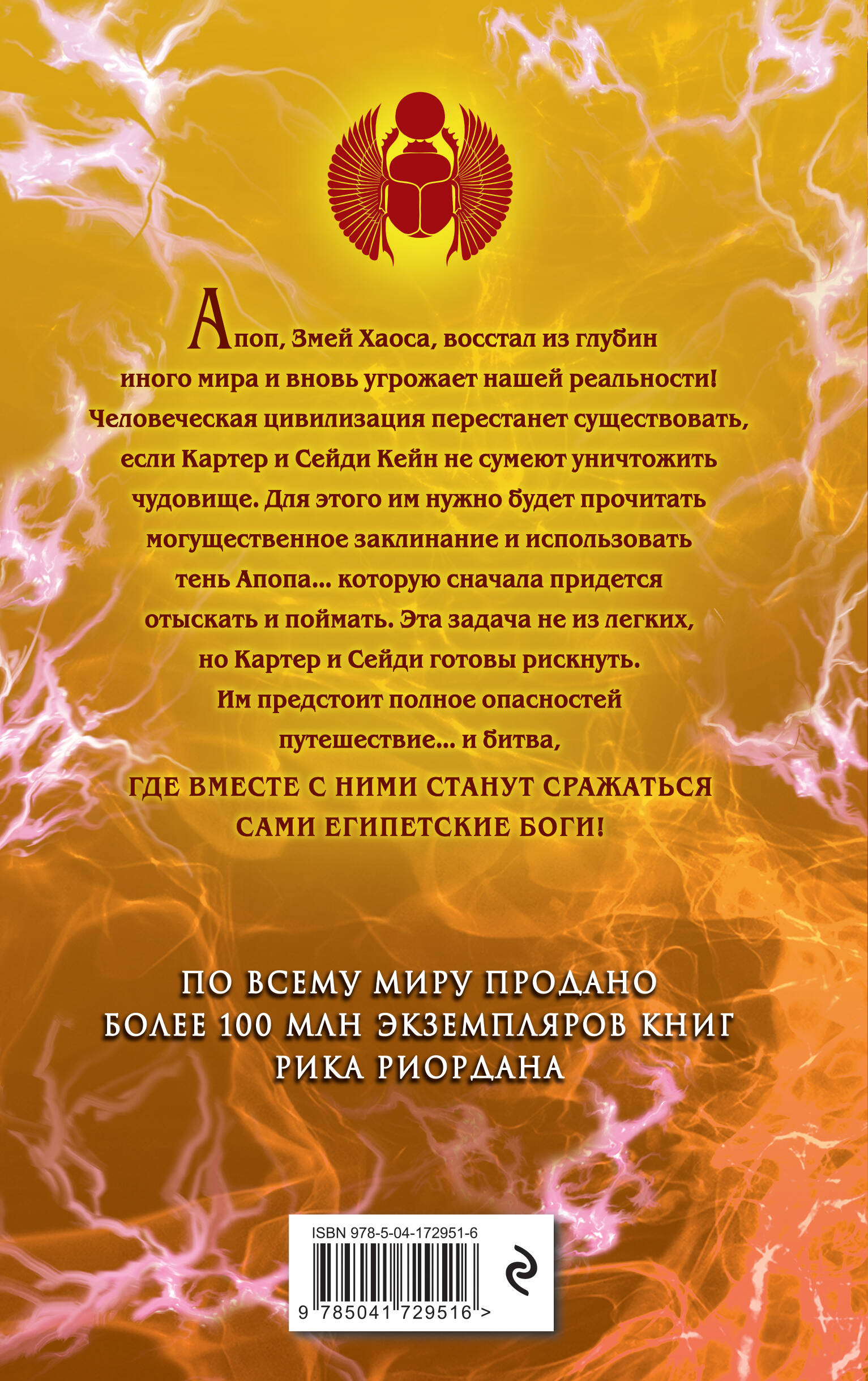 Все, чего люди добились со времен пирамид, уже завтра может стать пылью - ведь Апоп, Змей Хаоса, жаждет разрушить человеческую цивилизацию и саму нашу реальность. Чтобы помешать ему, Картер и Сейди Кейн готовы сделать все, что в их силах. И даже больше. Юным магам предстоит отыскать тень змея, заточить ее в артефакт, а затем прочитать одно очень сложное заклинание. Ошибка в нем будет стоить ребятам жизни… но этот призрачный шанс лучше, чем никакого! Сейди Кейн не может решить, какой из двух парней нравится ей больше. Картер переживает, что не сумеет оправдать возложенные на него ожидания… Но эти проблемы ничто по сравнению с надвигающимся концом света!