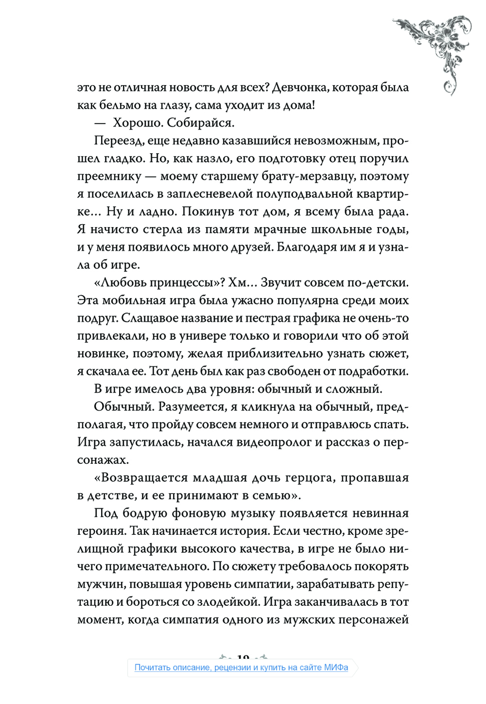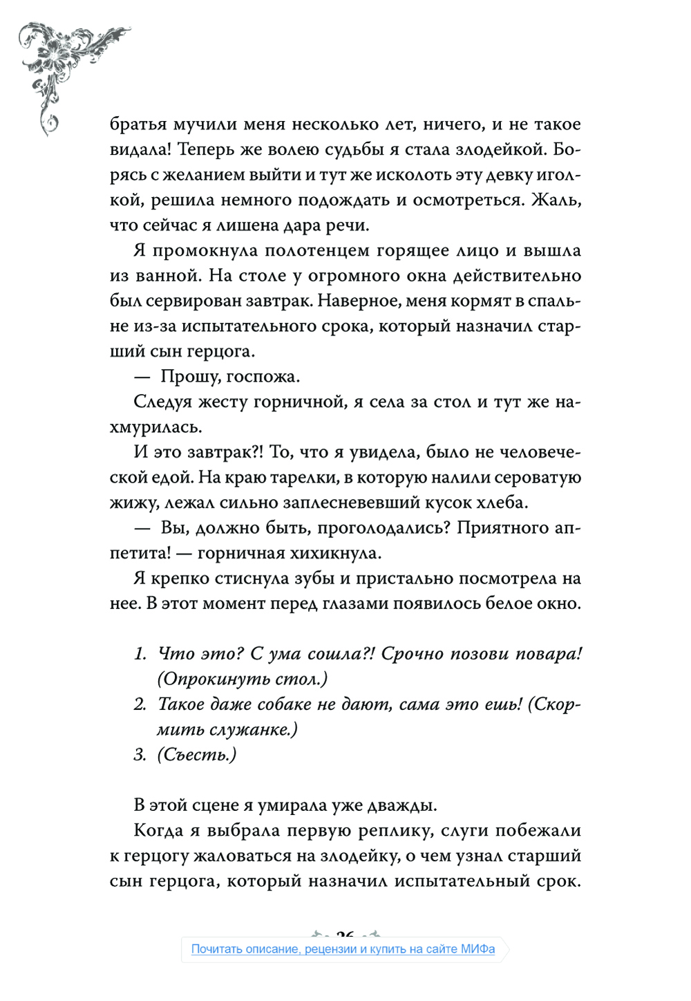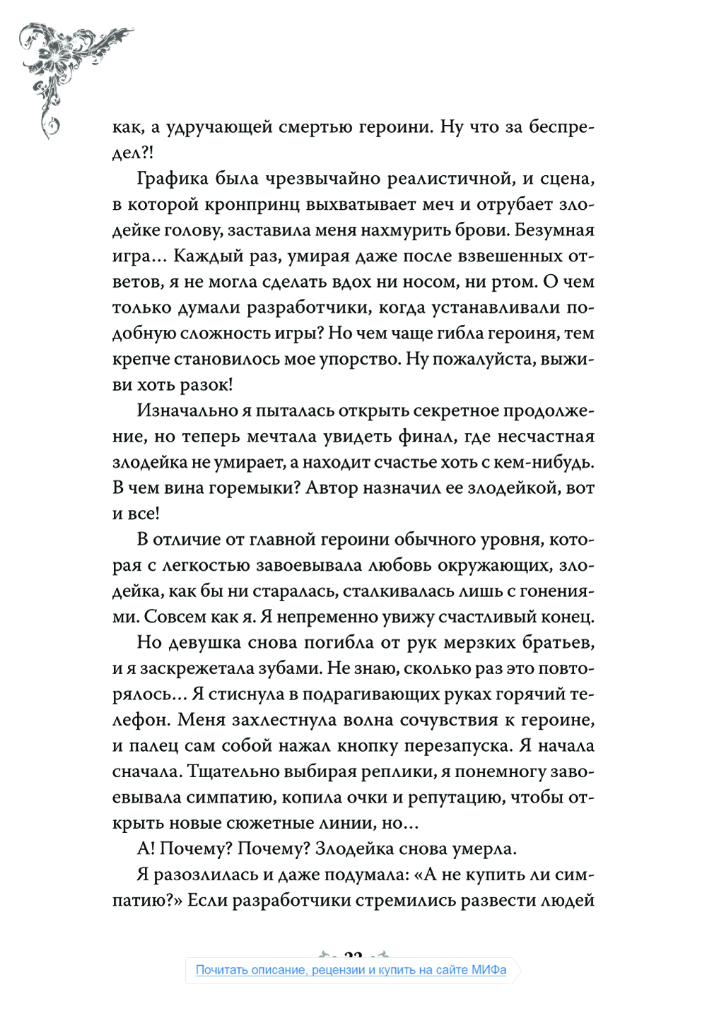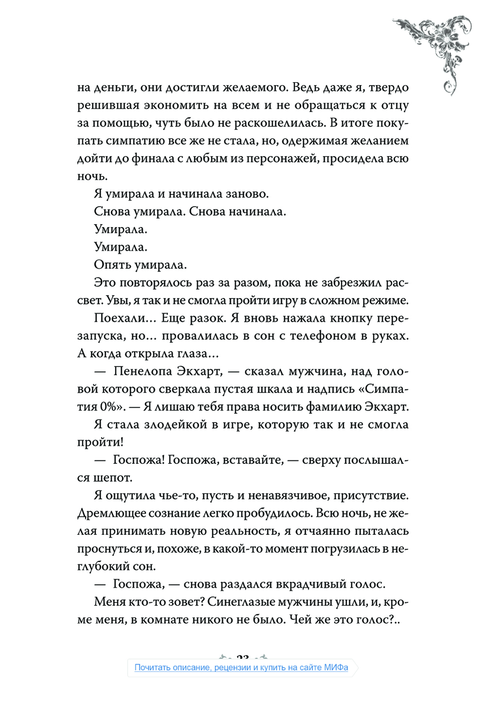 «Но я не могу умереть! Я же с таким трудом ушла из того чертова дома! Неужели для того, чтобы погибнуть в какой-то игре?! Нет, я ни за что не умру». Ее жизнь напоминает кошмарный сон: дни наполнены издевательствами сводных братьев, травлей в школе и равнодушием властного отца. Поступив в университет, она наконец обретает свободу и вырывается из-под опеки ужасной семьи. Казалось бы, все невзгоды позади и теперь ее ждет новая жизнь с чистого листа... Но однажды утром она просыпается... Пенелопой Экхарт, главной злодейкой в популярной онлайн-игре. Невероятно, но жизнь бедняжки так похожа на ее собственную! Братья, отец, прислуга и даже кронпринц - все вокруг ненавидят ее и желают ей смерти. Виртуальный мир игры живет по своим безумным правилам. Каждое неверное слово или поступок ведут к гибели. Чтобы выжить, злодейке нужно завоевать сердце одного из мужчин. Однако это не так-то просто, ведь все они ее презирают. Удастся ли Пенелопе растопить лед в сердцах окружающих и обмануть смерть?| Издательство | Манн, Иванов и Фербер |