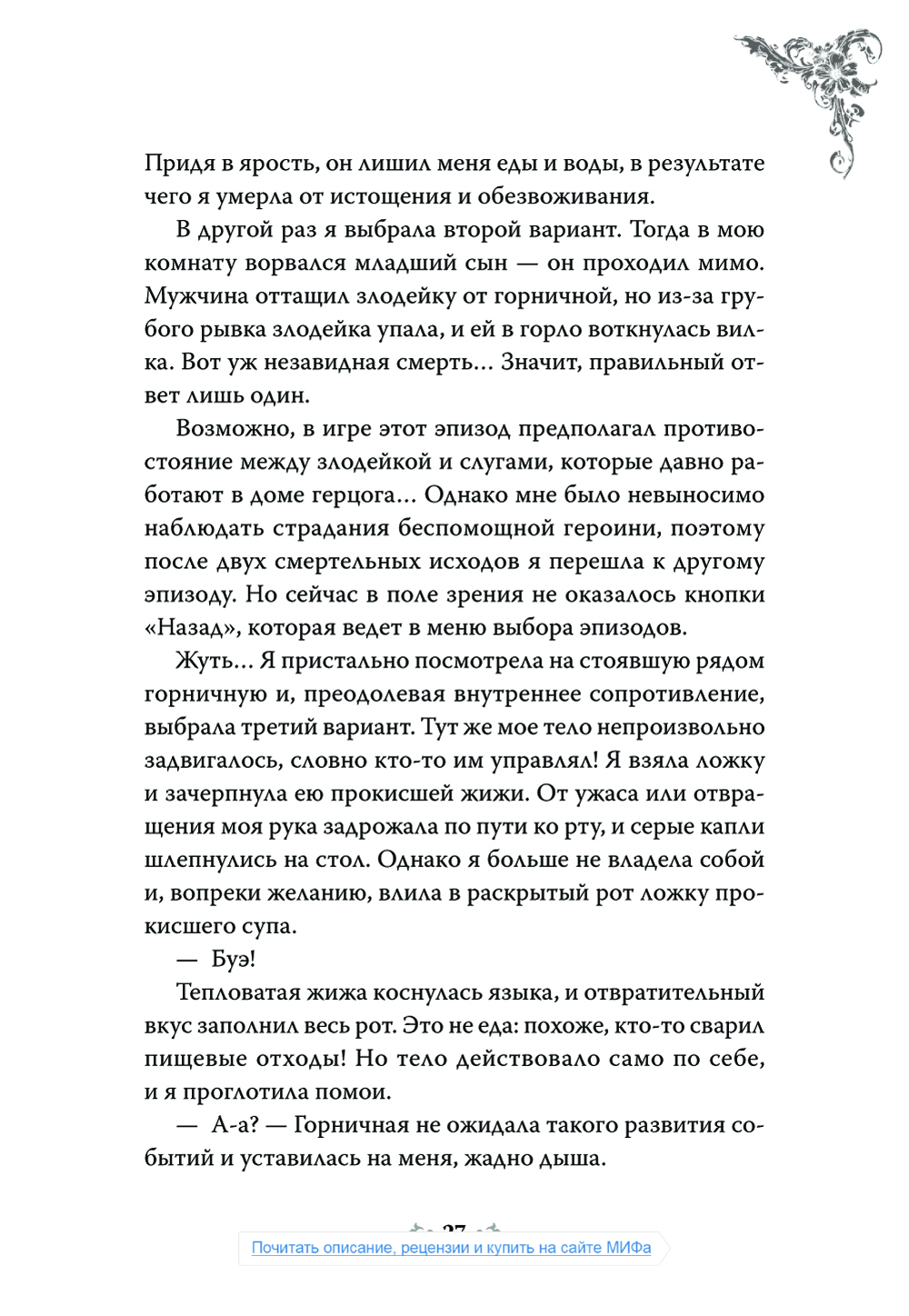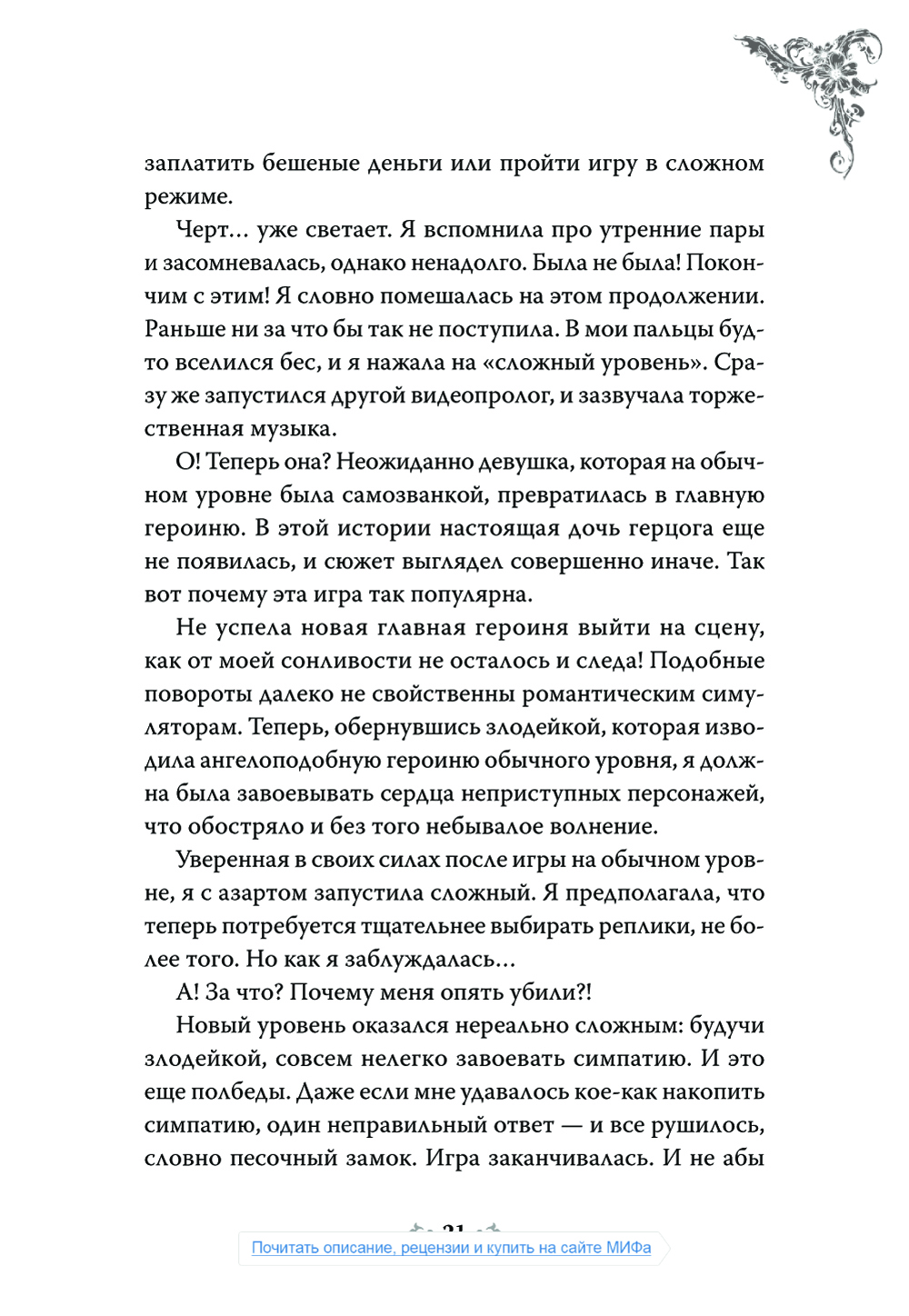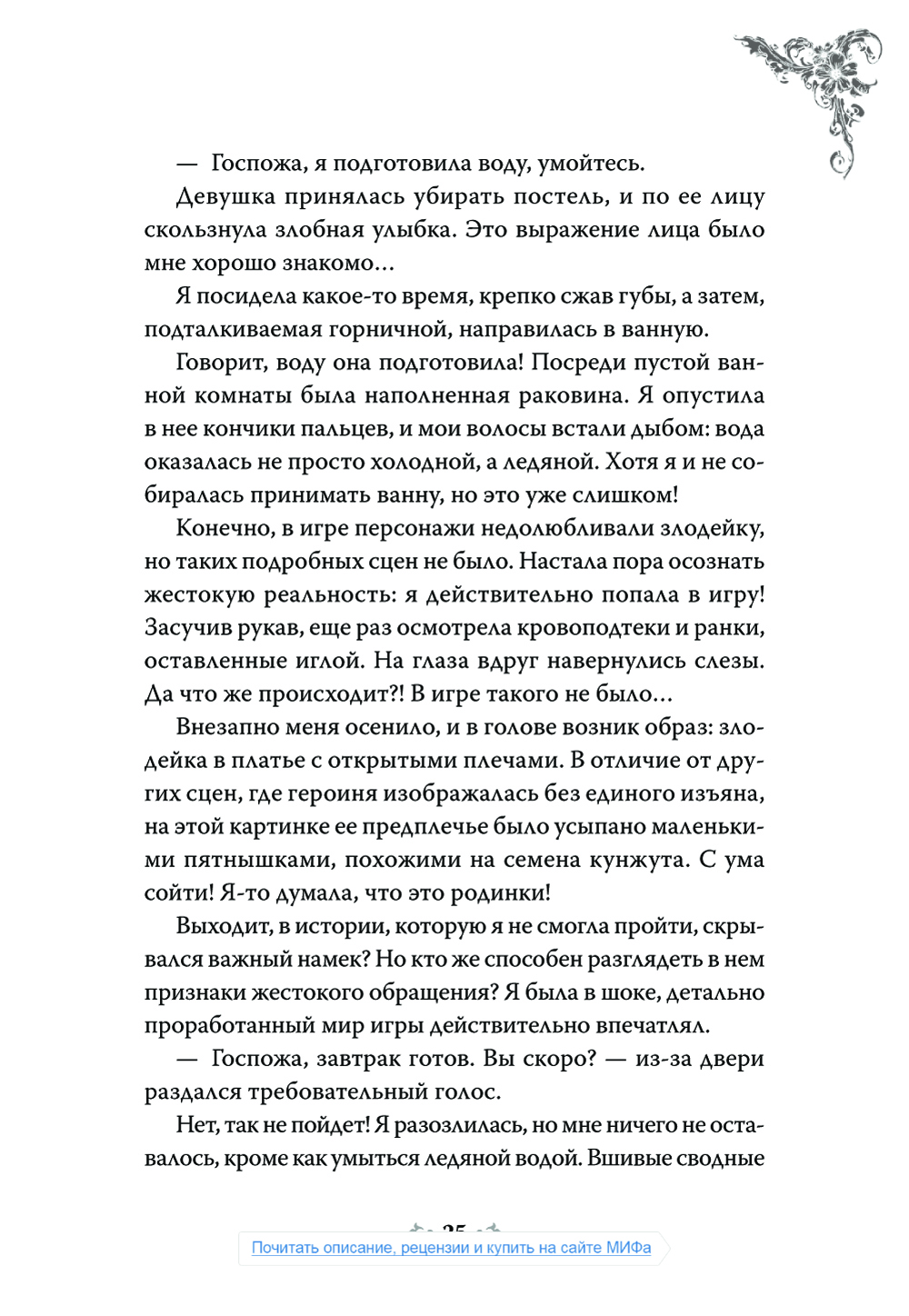 «Но я не могу умереть! Я же с таким трудом ушла из того чертова дома! Неужели для того, чтобы погибнуть в какой-то игре?! Нет, я ни за что не умру». Ее жизнь напоминает кошмарный сон: дни наполнены издевательствами сводных братьев, травлей в школе и равнодушием властного отца. Поступив в университет, она наконец обретает свободу и вырывается из-под опеки ужасной семьи. Казалось бы, все невзгоды позади и теперь ее ждет новая жизнь с чистого листа... Но однажды утром она просыпается... Пенелопой Экхарт, главной злодейкой в популярной онлайн-игре. Невероятно, но жизнь бедняжки так похожа на ее собственную! Братья, отец, прислуга и даже кронпринц - все вокруг ненавидят ее и желают ей смерти. Виртуальный мир игры живет по своим безумным правилам. Каждое неверное слово или поступок ведут к гибели. Чтобы выжить, злодейке нужно завоевать сердце одного из мужчин. Однако это не так-то просто, ведь все они ее презирают. Удастся ли Пенелопе растопить лед в сердцах окружающих и обмануть смерть?| Издательство | Манн, Иванов и Фербер |