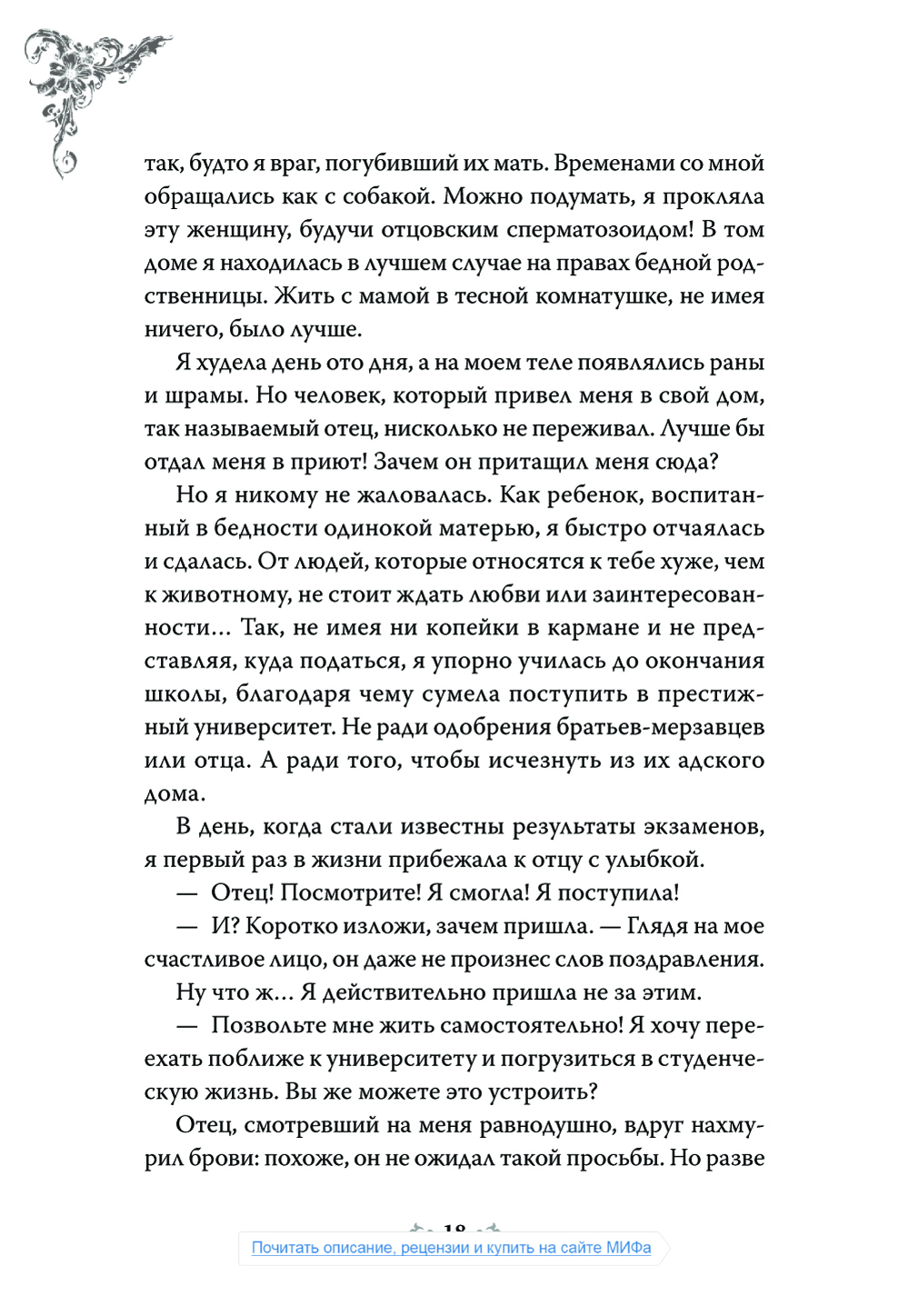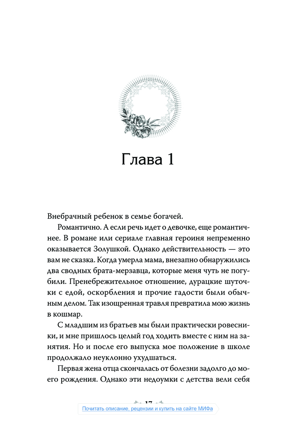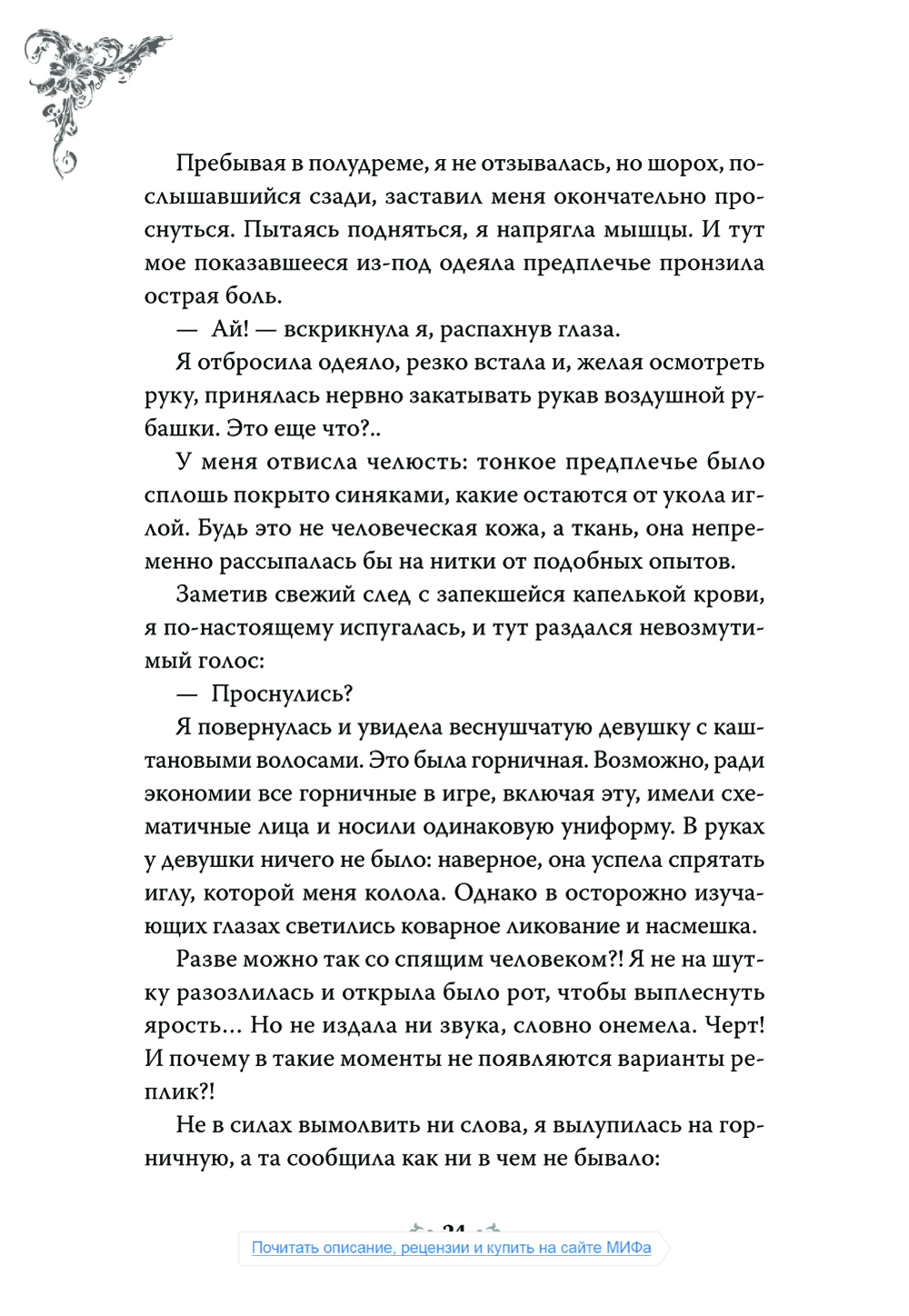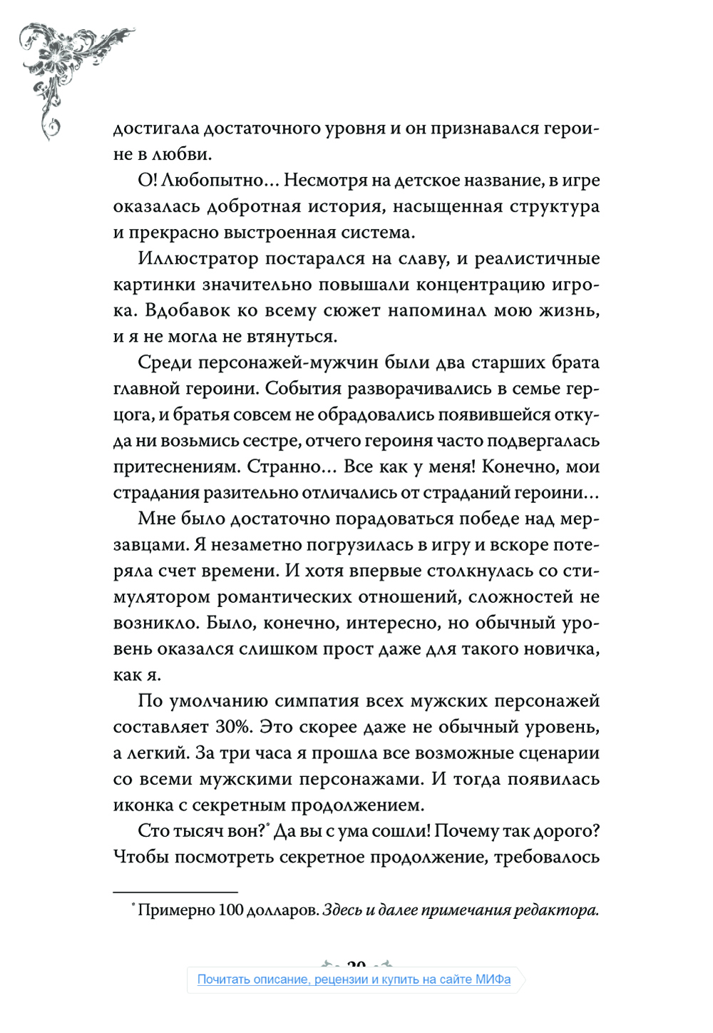 «Но я не могу умереть! Я же с таким трудом ушла из того чертова дома! Неужели для того, чтобы погибнуть в какой-то игре?! Нет, я ни за что не умру». Ее жизнь напоминает кошмарный сон: дни наполнены издевательствами сводных братьев, травлей в школе и равнодушием властного отца. Поступив в университет, она наконец обретает свободу и вырывается из-под опеки ужасной семьи. Казалось бы, все невзгоды позади и теперь ее ждет новая жизнь с чистого листа... Но однажды утром она просыпается... Пенелопой Экхарт, главной злодейкой в популярной онлайн-игре. Невероятно, но жизнь бедняжки так похожа на ее собственную! Братья, отец, прислуга и даже кронпринц - все вокруг ненавидят ее и желают ей смерти. Виртуальный мир игры живет по своим безумным правилам. Каждое неверное слово или поступок ведут к гибели. Чтобы выжить, злодейке нужно завоевать сердце одного из мужчин. Однако это не так-то просто, ведь все они ее презирают. Удастся ли Пенелопе растопить лед в сердцах окружающих и обмануть смерть?| Издательство | Манн, Иванов и Фербер |