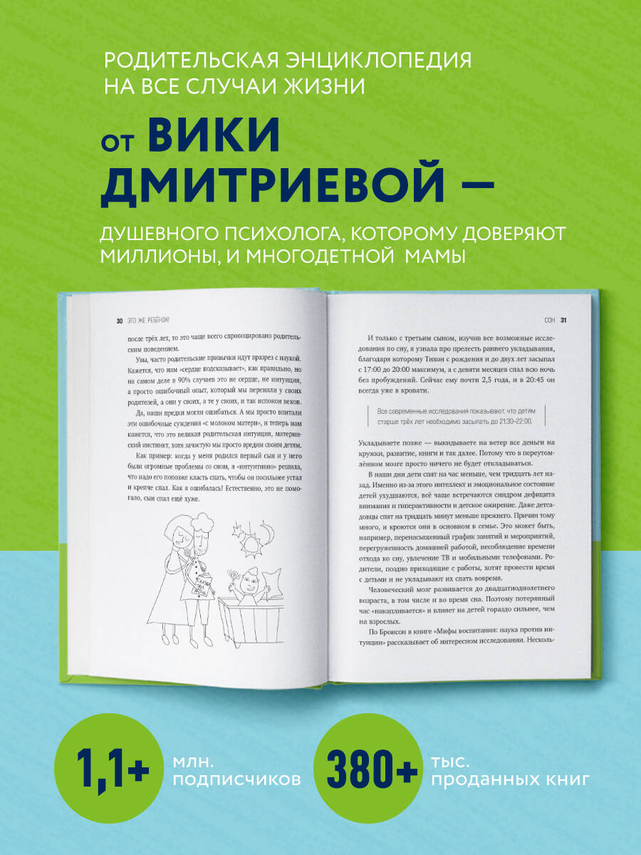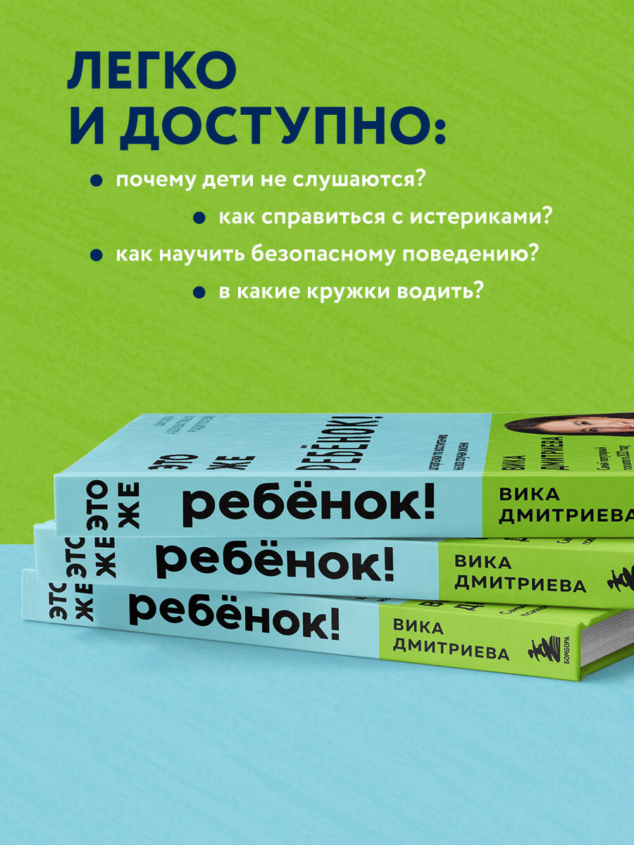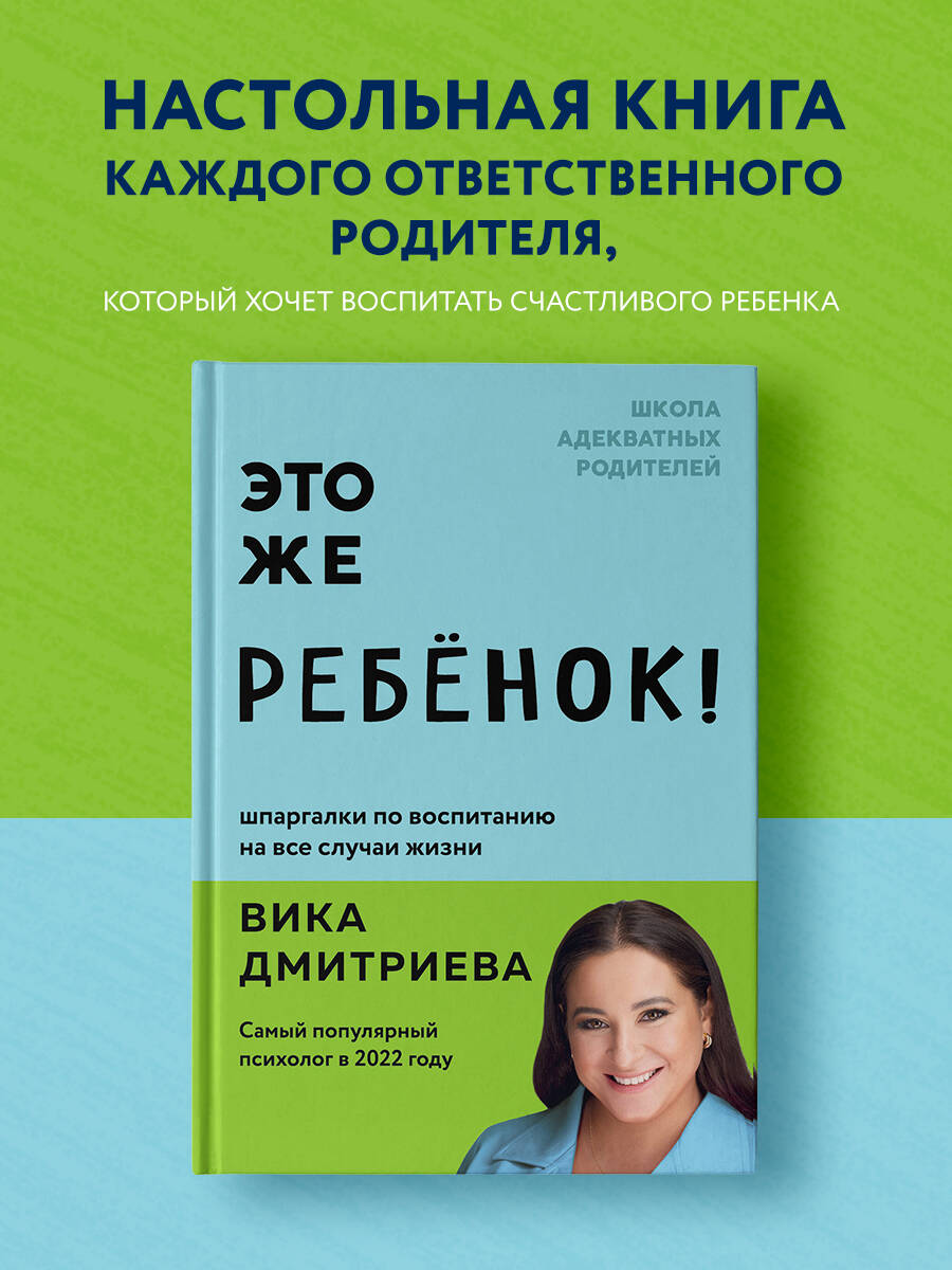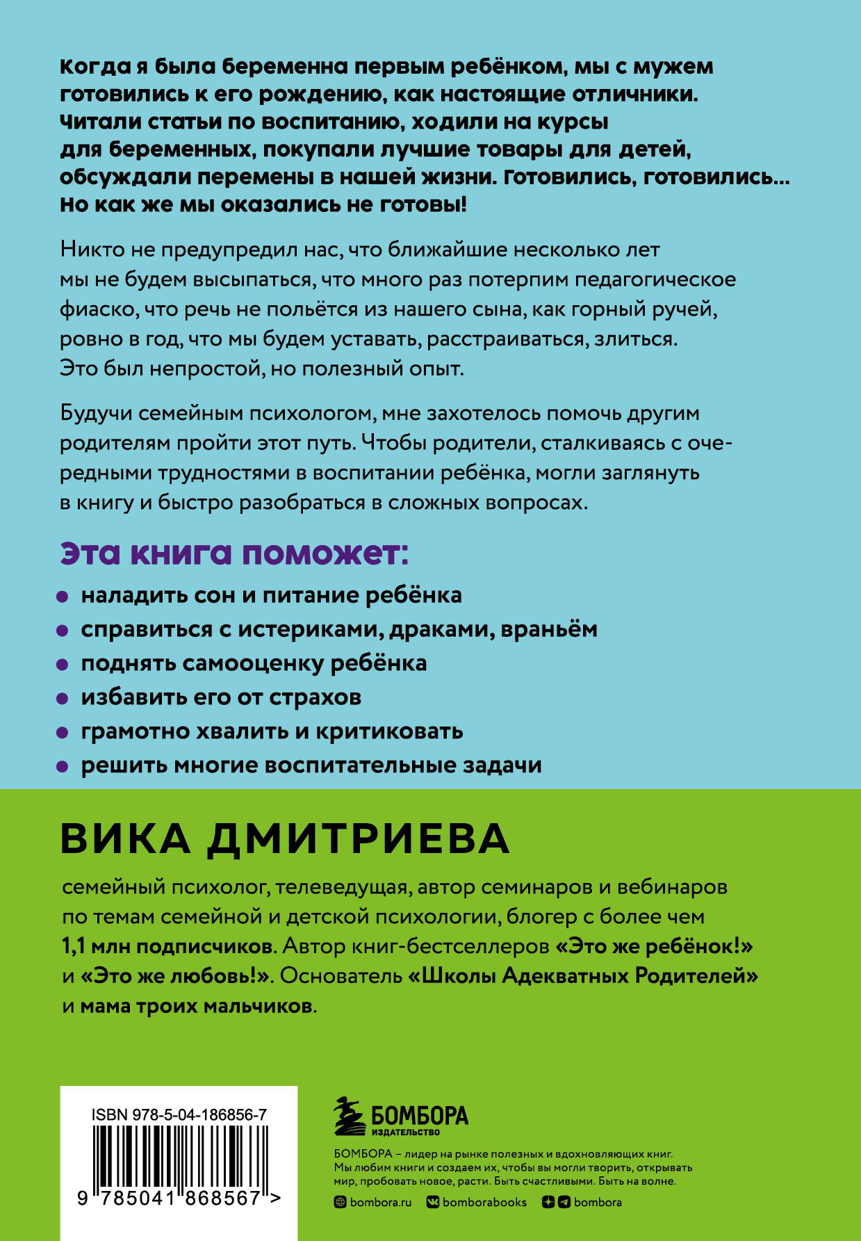 Продано более 170 000 экземпляров. ВИКА ДМИТРИЕВА - семейный психолог, телеведущая, автор семинаров и вебинаров по темам семейной и детской психологии, блогер с более чем 1,1 млн подписчиков. Автор книг-бестселлеров: «Это же ребенок! и «Это же любовь!», основатель «Школы Адекватных Родителей» и мама троих мальчиков. Это настоящая родительская энциклопедия на все случаи жизни, написанная, к тому же, с юмором. Книга будет наиболее полезна родителям детей от трех до семи лет. Если у вас нет времени читать, но есть большое желание понять, что творится с ребенком и как поправить ситуацию. Если вы хотите конкретных решений, а не долгих нравоучений на философские темы о счастье родительства, то эта книга для вас. Из книги вы узнаете: - от чего зависит самооценка ребенка; - советы в случае, если он постоянно болеет; - как хвалить и критиковать ребенка; - как научить его безопасному поведению. Цитаты из книги: «После трех лет можно учить давать сдачу. Но сдачу можно давать только на физическую агрессию, то есть если назвали дураком - в глаз бить не надо. Удар в ответ только на удар!» «До 3-5 лет почти у всех детей развита физическая агрессия - бью, кусаю, щипаю. Это признак нормального развития ребенка». «Уясняем: злиться можно. Но причинять боль в порыве злости никому нельзя». «Для ребенка поведение родителей - это единственная модель разрешения конфликтов. Учите своим примером!» «Если нет крика, ора и драк, то пусть дети разбираются сами». «Не реагировать на жалобы, говорить: "Ябедничать плохо!", "Разбирайтесь сами!" - это обрекать себя на то, что дети не придут к вам, когда произойдет что-то действительно серьезное». «Главная причина детского вранья - стремление избежать наказания. Дети, живущие в постоянном страхе наказания за вранье, лгут не меньше. Просто они становятся искусными обманщиками и их реже ловят на вранье».| Издательство | ООО "Издательство "Эксмо" |