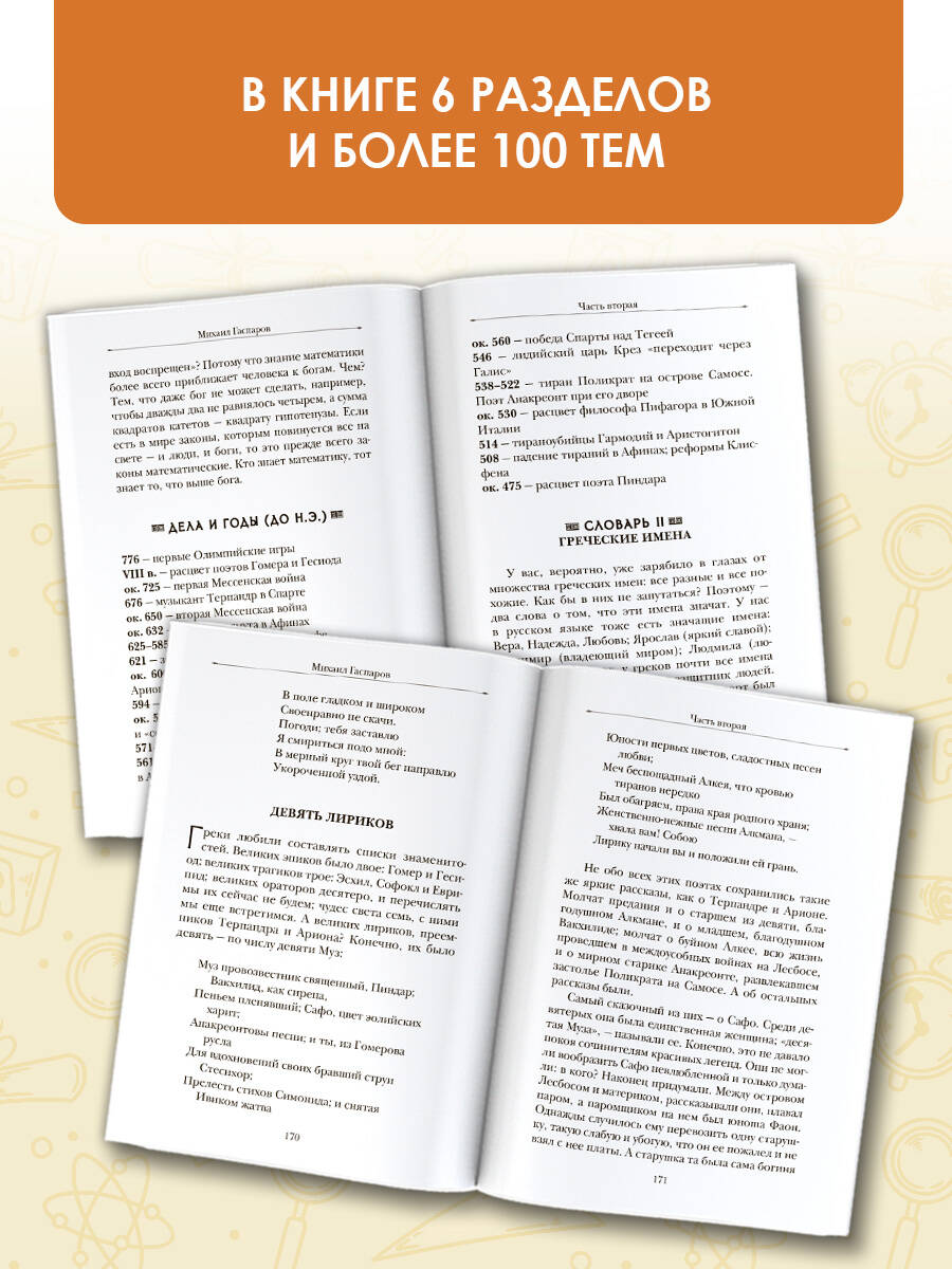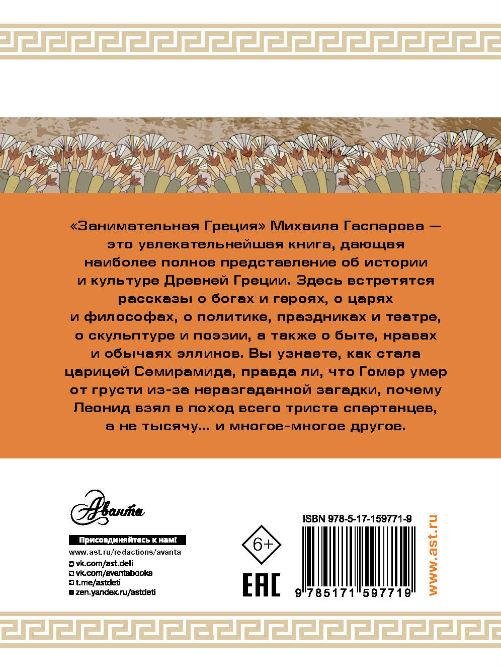 Михаил Леонович Гаспаров (1935 - 2005) - литературовед, переводчик, лауреат множества государственных премий, автор книг, по праву считающихся классикой научно-популярного жанра. Книга "Занимательная Греция" просто и увлекательно рассказывает о древнегреческой культуре и очень любима как взрослыми читателями, так и детьми. Она разделена на шесть частей, в которых вам встретятся рассказы о богах и героях, о царях и философах, о политике, праздниках и театре, о скульптуре и поэзии, а также о быте, нравах и обычаях эллинов. Вы узнаете, как стала царицей Семирамида, правда ли, что Гомер умер от грусти из-за неразгаданной загадки, почему Леонид взял в поход всего триста спартанцев, а не тысячу... и многое-многое другое. Для среднего школьного возраста.