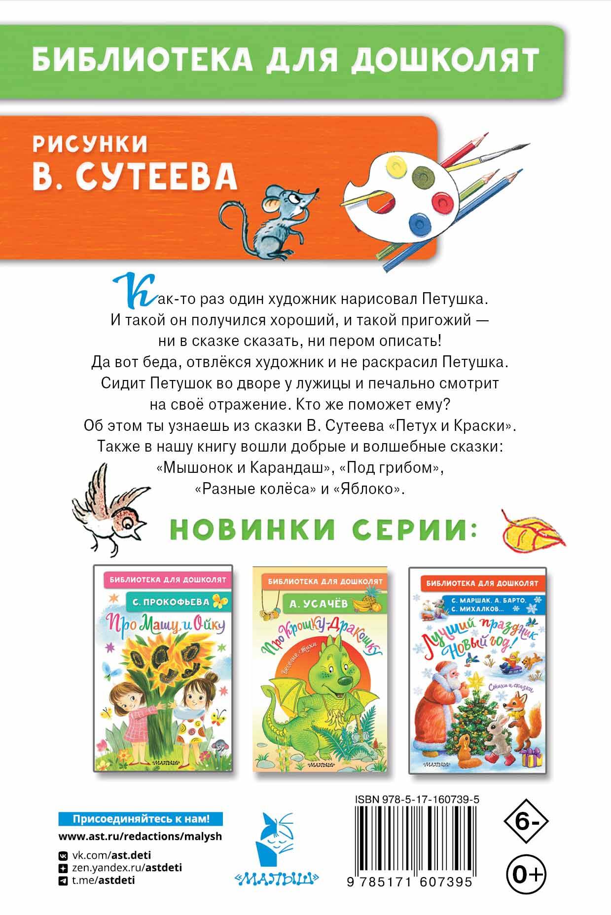 Как-то раз один художник нарисовал Петушка. И такой он получился хороший, и такой пригожий - ни в сказке сказать, ни пером описать! Да вот беда, отвлёкся художник и не раскрасил Петушка. Сидит Петушок во дворе у лужицы и печально смотрит на своё отражение. Кто же поможет ему? Об этом ты узнаешь из сказки В. Сутеева «Петух и Краски». Также в нашу книгу вошли добрые и волшебные сказки «Мышонок и Карандаш», «Под грибом», «Разные колёса» и «Яблоко».| Издательство | Издательство "АСТ" |