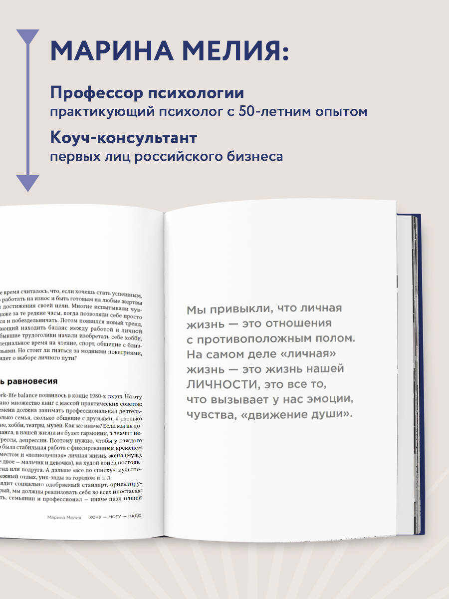 Эта книга объединяет в себе два бестселлера Марины Мелия, посвященные психологии успеха и эффективной коммуникации - «Хочу - Могу - Надо. Узнай себя и действуй» и «Всё не так. Как выбираться из тупиков общения, в которые мы сами себя загоняем». В первой части автор делится инструментами для саморазвития, проверенными десятилетиями практической работы. Когда мы оказываемся на перепутье, приходит время остановиться, задуматься о себе, своих желаниях и будущем. Почему мы живем именно так? И как привести жизнь в соответствие с собственными стремлениями и мечтами? В этом поможет разобраться авторский метод, который можно применять без помощи психолога. Во второй части Марина Мелия поднимает тему коммуникационных тупиков и ловушек, в которые попадают даже самые опытные и умудренные из нас. Практикующий психолог предлагает посмотреть на самые запутанные ситуации общения под новым углом и помогает найти из них выход. Вы узнаете: - как любимая сказка повлияла на вашу судьбу; - когда важно говорить «нет»; - как поспорить, не поссорившись; - что мешает вам принимать решения; - как выйти из нездоровых отношений; - можно ли изменить свой жизненный сценарий; - как делать то, что хочется, и быть счастливым. Об авторе МАРИНА МЕЛИЯ - профессор психологии с 50-летним опытом практической работы, коуч-консультант первых лиц российского бизнеса, автор бестселлеров «Метод Марины Мелия. Как усилить свою силу», «Отстаньте от ребенка! Простые правила мудрых родителей» и «Мама рядом! Главный секрет первого года жизни».| Издательство | ООО "Издательство "Эксмо" |