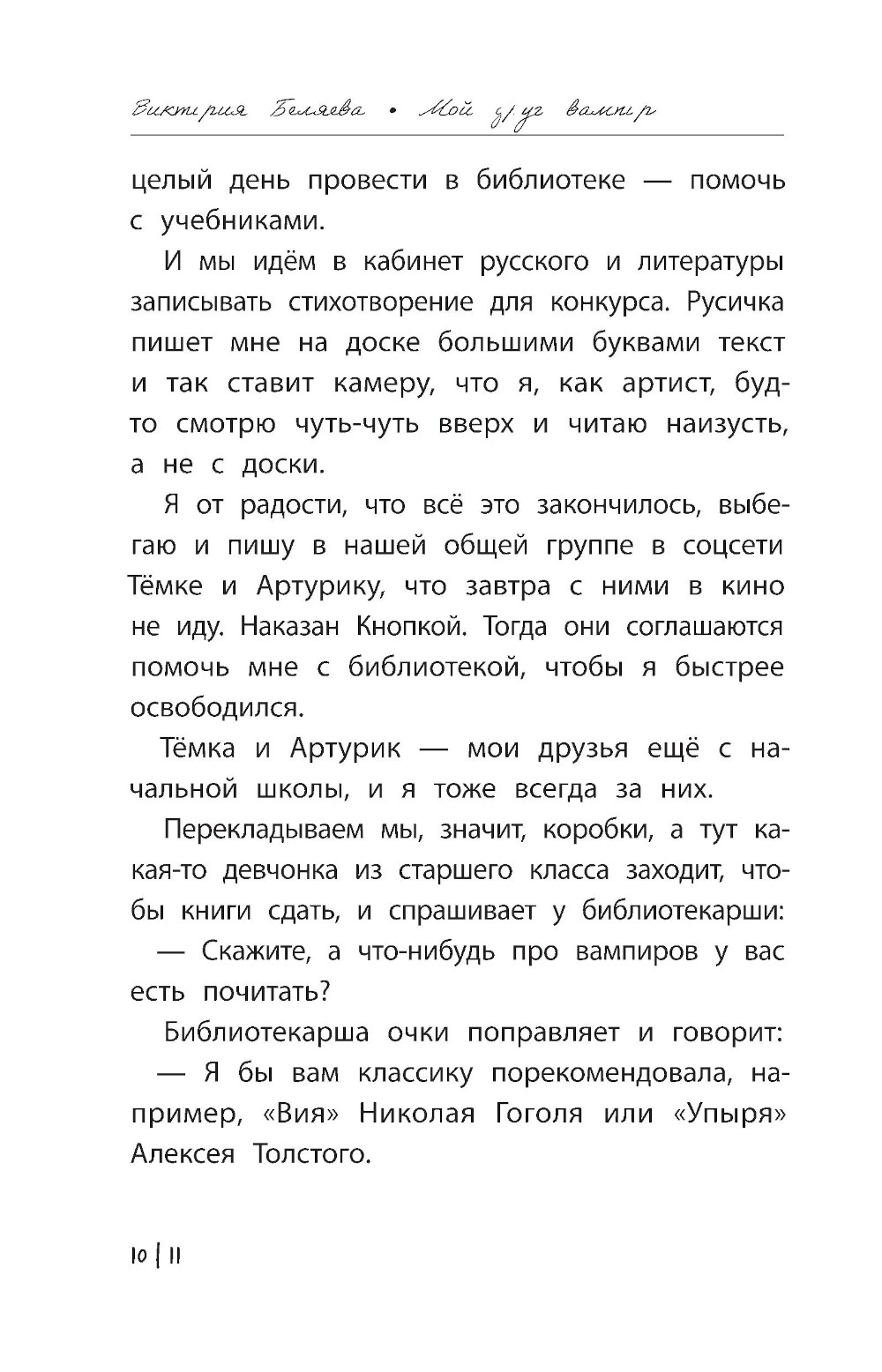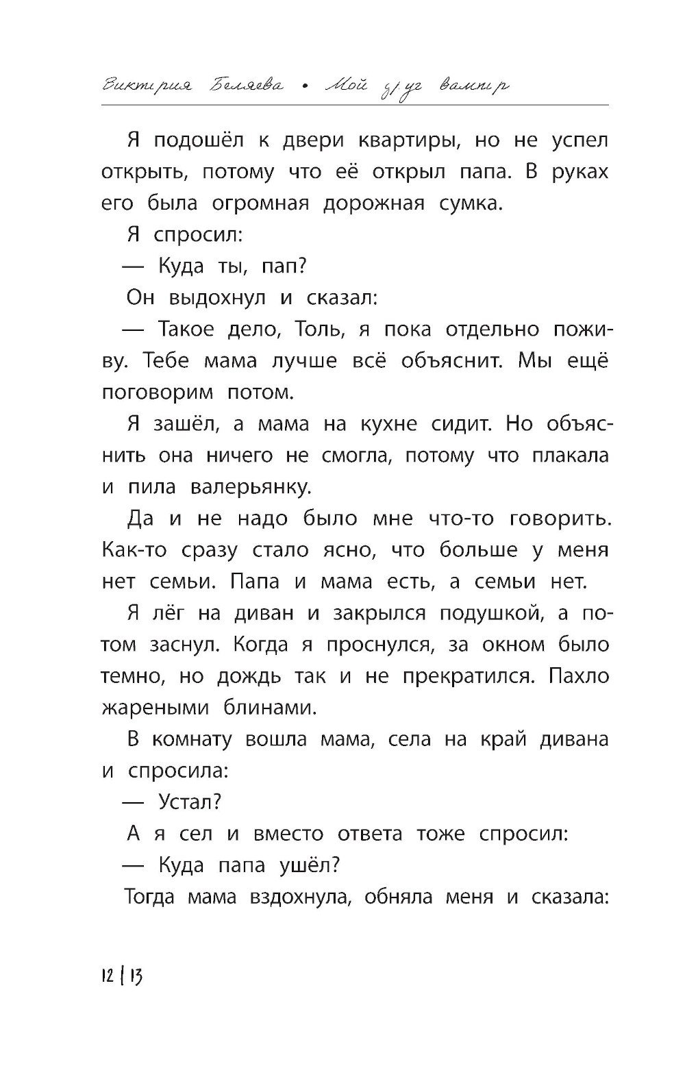 «Мой друг вампир» - история взросления, поиска себя, настоящей дружбы и первой любви самого обычного мальчишки -Толика Толкунова. Внезапно его планы и мечты становятся далёким прошлым. Всё, что было важным и ценным, утрачивает значение. Кажется, что весь мир ополчился против него. Толик остаётся один на один со своими бедами, теряет товарищей, крепкую семью, место, где вырос. Всё, что он любил, рушится. В это самое время с Толиком начинают происходить фантастические события и встречи. Обстоятельства, которые прежде казались Толику ужасными, открывают ему новую, яркую главу жизни.| Издательство | Феникс |