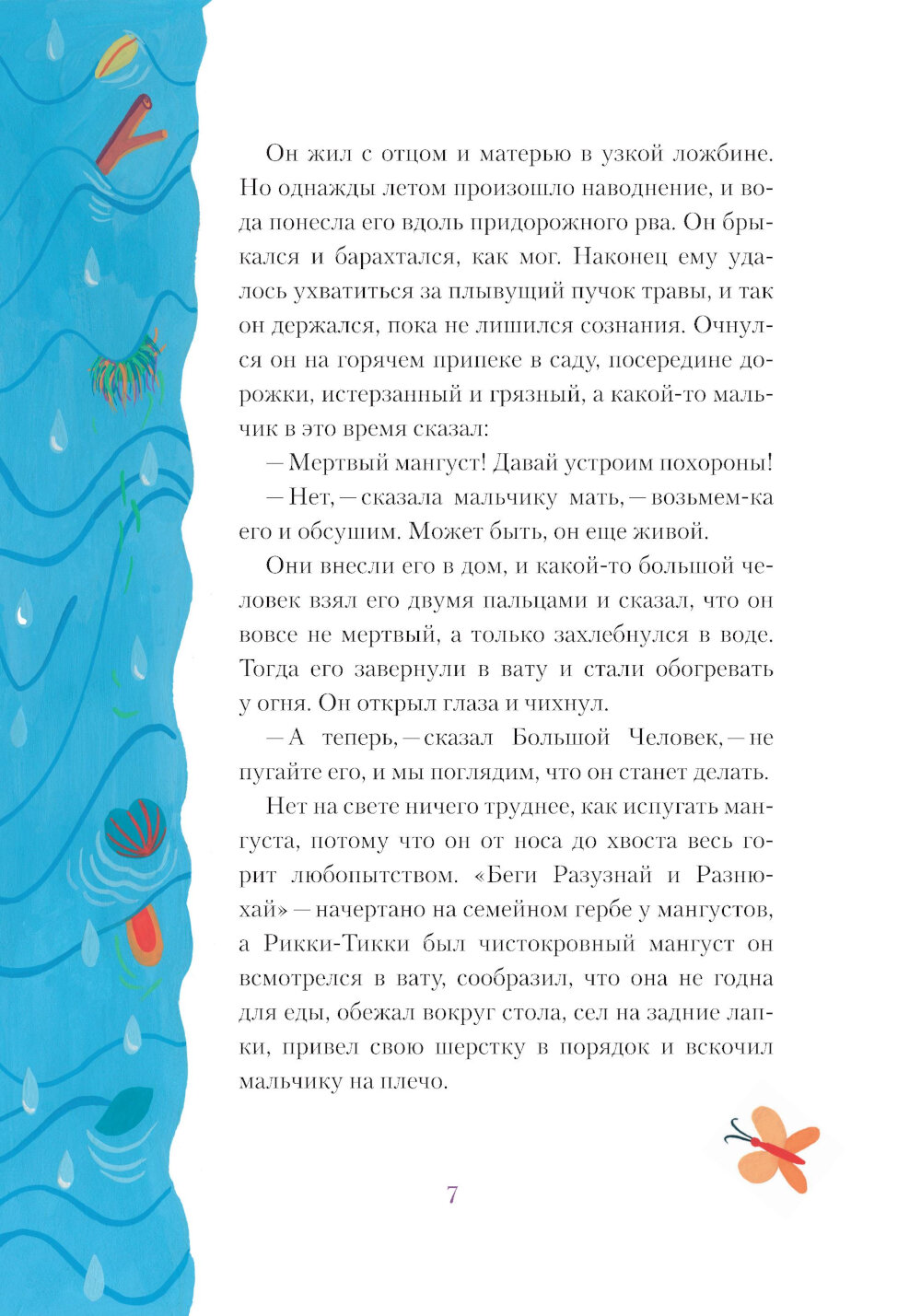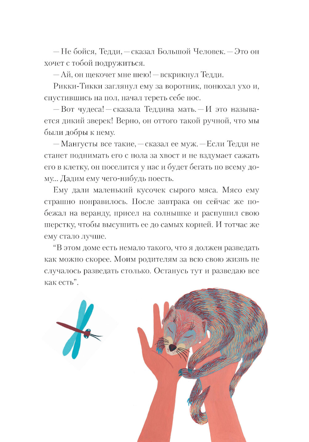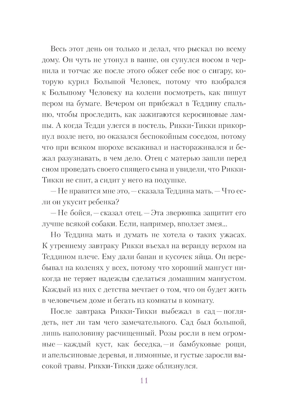 Сказка «Рикки-Тикки-Тави» нобелевского лауреата Редьярда Киплинга - о добре и смелости, о зле и коварстве. Проживший много лет в Индии, Киплинг прекрасно знал природу и культуру этих мест, поэтому его сказки не только увлекательны, но и познавательны. Главный герой сказки - Рикки-Тикки-Тави - молодой мангуст, во время наводнения его уносит потоком от родителей, и он попадает в семью людей, которые его приютили и полюбили. В саду их дома живет мускусная крыса Чучундра, птица-портной Дарси и его жена. И здесь же Рикки-Тикки-Тави сталкивается с ядовитой змейкой Караит и с кобрами Нагом и Нагайной, с которыми ему предстоит сразиться. Как же маленькому неопытному мангусту решиться на поединок с двумя огромными кобрами? Но ведь под угрозой жизнь его друзей - мальчика Тедди и его родителей. Боевой клич отважного мангуста «Рикки-тикки-рикки-тикки-чк!» запомнится всем, прочитавшим эту сказку. А верное, самоотверженное сердце Рикки-Тикки-Тави сделает каждого ребенка не только храбрее, но и добрее. Для среднего школьного возраста.| Издательство | Текст |