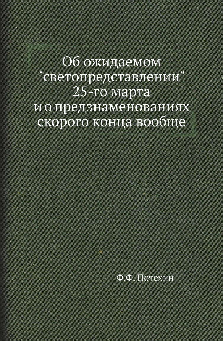 Эта книга - репринт оригинального издания (издательство "С.- Петербург, Тип. "Печатный труд"", 1912 год), созданный на основе электронной копии высокого разрешения, которую очистили и обработали вручную, сохранив структуру и орфографию оригинального издания. Редкие, забытые и малоизвестные книги, изданные с петровских времен до наших дней, вновь доступны в виде печатных книг. В 1912 году Ф. Ф. Потехин опубликовал в Петербурге брошюру «Об ожидаемом светопреставлении 25 марта и о предзнаменованиях скорого конца», обличая суеверных людей, ожидавших светопреставления 25 марта 1912 года, так как этот день пасха совпала с благовещением.