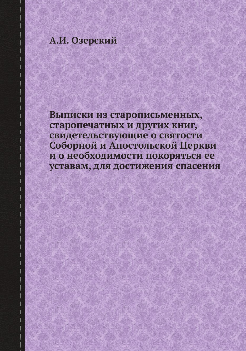 Эта книга - репринт оригинального издания (издательство "Москва, Университетская типография", 1862 год), созданный на основе электронной копии высокого разрешения, которую очистили и обработали вручную, сохранив структуру и орфографию оригинального издания. Редкие, забытые и малоизвестные книги, изданные с петровских времен до наших дней, вновь доступны в виде печатных книг. Полемический противораскольнический свод, составленный купцом Андрианом Ивановичем Озерским. В своде собраны выдержки из старопечатных книг, подтверждающие неправоту старообрядцев. Впервые два тома «Выписок» А. И. Озерского были изданы в 1862 г. В предисловии к первому изданию было опубликовано следующее высказывание Адриана Озерского: «Желая узнать причины уклонения раскольников от единства святой матери своей Православной Вселенской Церкви, с юности моей я посвятил свободное от обычных моему сословию занятий время чтению и изучению старопечатных книг и других памятников письменности, на которые мнимые старообрядцы к оправданию своего уклонения от Церкви ссылаются, как на книги древнеотеческие, правильные, неповрежденные исправлениями Патриарха Никона. … Да послужат собранные мною свидетельства старопечатных книг и древних рукописей к обращению в единение веры и союз мира с Церковью моих собратий. … Привожу свидетельства древних книг и рукописей без всякого изменения, не исправляя даже грамматических ошибок в словосочетании и письме, а оставляя их в том виде, как они читаются или пишутся в книгах и рукописях, уважаемых самими староверами».