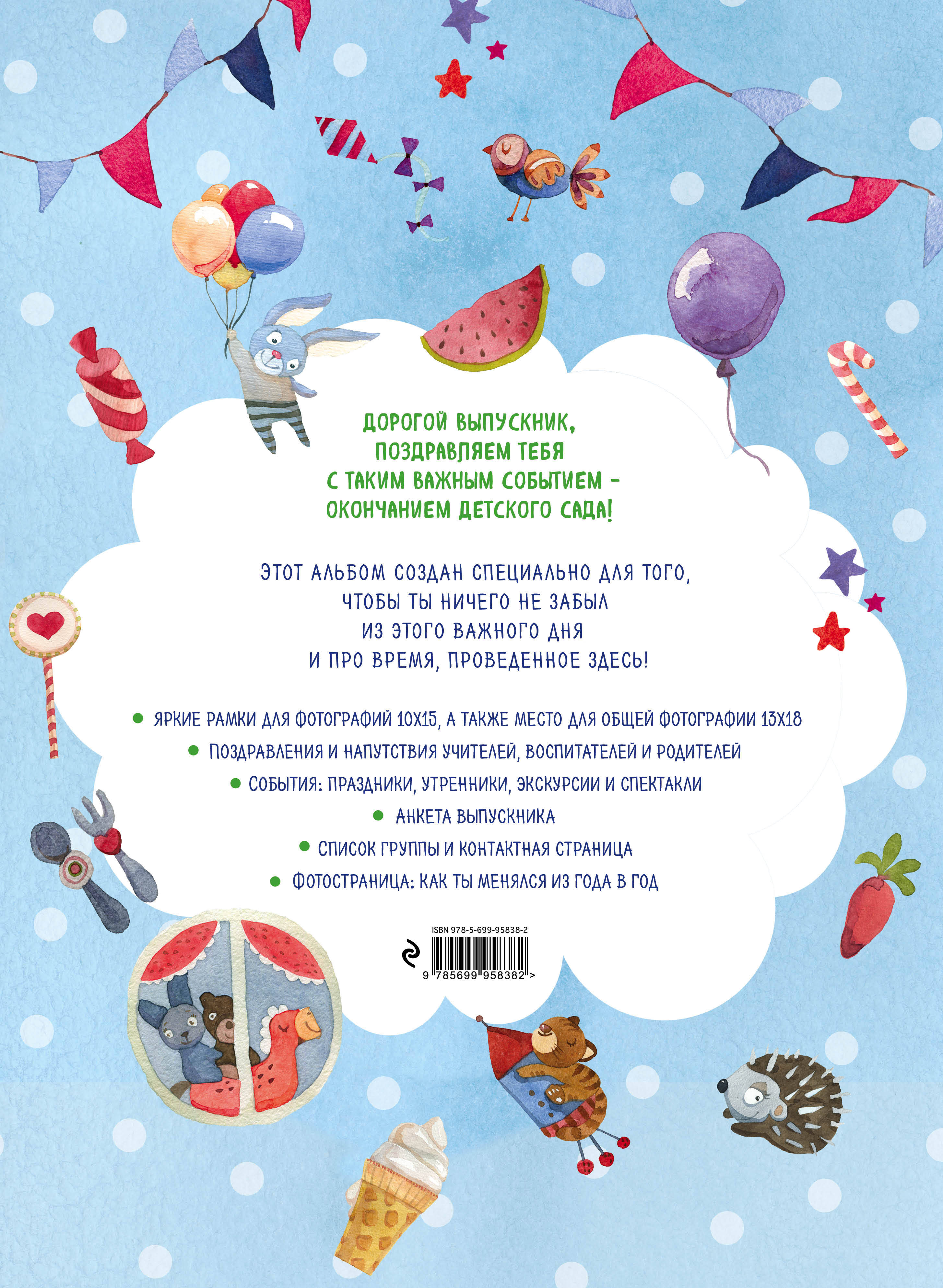 Об альбоме: Нарядный альбом для выпускника детского сада. С его помощью родители смогут сохранить самые яркие моменты детства дошкольника. Для кого: Альбом станет отличным подарком ребёнку и его родителям. Особенности альбома: - возможность вклеить фотографии с занятий, утренников, спектаклей и экскурсий - праздничное оформление - большой формат, плотная бумага - рамки для фотографий (10х15), место для общей фотографии (13х18) - поздравления и напутствия учителей, воспитателей и родителей - список группы и контактная страница - фотостраница: как выпускник менялся из года в год| Издательство | Эксмо |