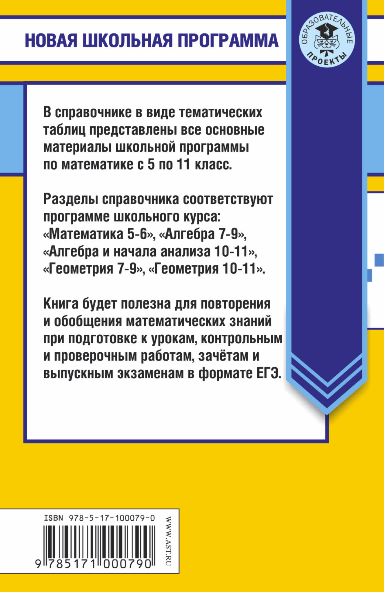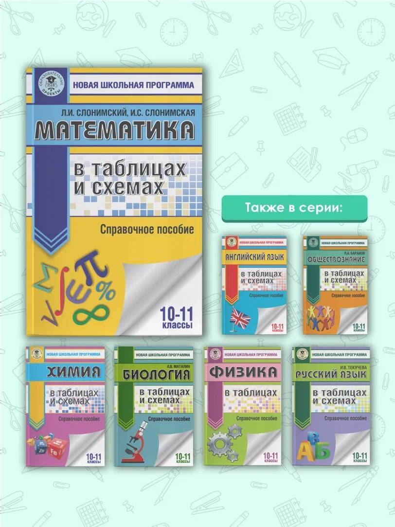 В справочнике в виде тематических таблиц представлены все основные материалы школьной программы по математике с 5 по 11 класс. Разделы справочника соответствуют программе школьного курса: "Математика 5-6", "Алгебра 7-9", "Алгебра и начало анализа 10-11", "Геометрия 7-9", "Геометрия 10-11". Книга будет полезна для повторения и обобщения математических знаний при подготовке к урокам, контрольным и проверочным работам, зачётам и выпускным экзаменам в формате ЕГЭ.