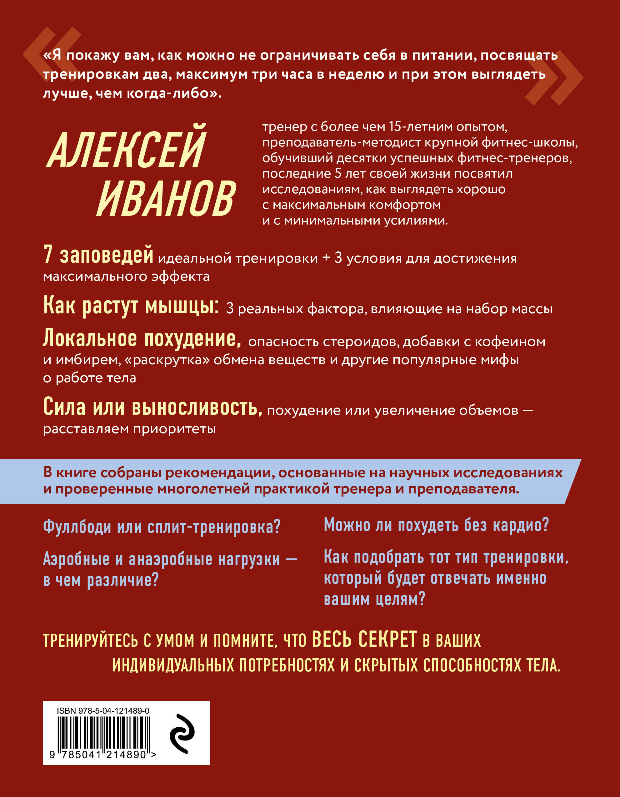 Вы практически не встретите здесь готовых рецептов. Знаете, почему? Им, конечно, можно следовать, но они не работают! Алексей Иванов, фитнес-тренер компании World Class и один из лучших тренеров России по версии Onfit Awards, более 15 лет изучает процесс тренировок. В своей книге он собрал только те рекомендации, что основаны на научной базе и исследованиях в области физиологии и проверены его многолетней практикой тренера и преподавателя. Можно ли похудеть без кардио? Фуллбоди или сплит-тренировка? Аэробные и анаэробные нагрузки - в чем различие? Накачать мышцы или похудеть? Как подобрать тот тип тренировки, который будет отвечать конкретно моим целям? Тренируйтесь с умом и помните, что весь секрет - в вас, ваших индивидуальных потребностях и скрытых способностях тела.| Издательство | ООО "Издательство "Эксмо" |