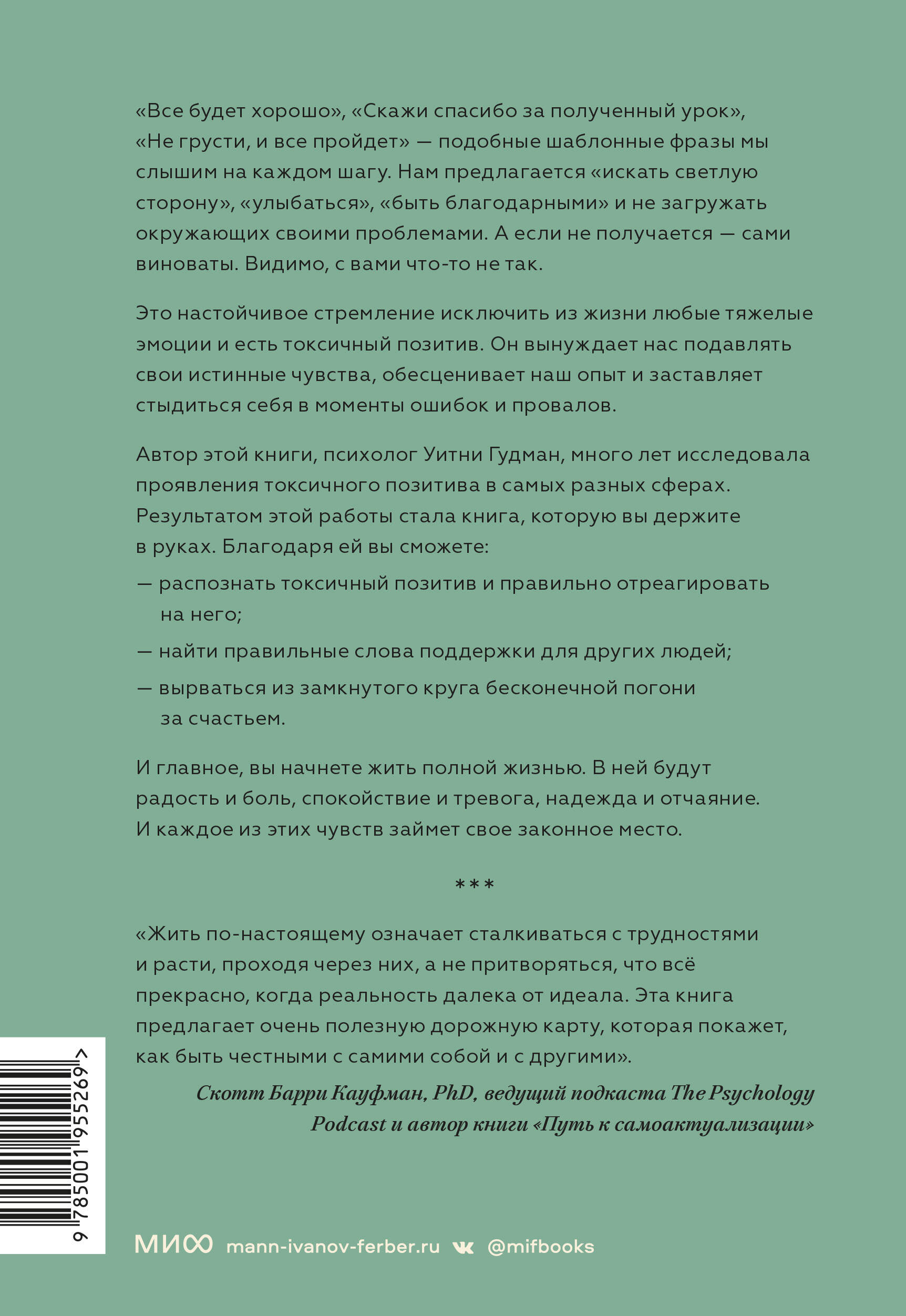 В этой книге востребованный психотерапевт Уитни Гудман делится результатами последних исследований, которые показывают, насколько эта токсичная позитивность вредна для нас и наших отношений, рассказывает, почему важно наконец признать свои настоящие эмоции, и описывает стратегии, которые позволят справиться с ними. Вернув себе разрешение чувствовать, вы сможете стать самими собой. В книге много примеров и историй из практики. Затрагиваются темы шейминга, восприятия тела, любви к себе, самопомощи.