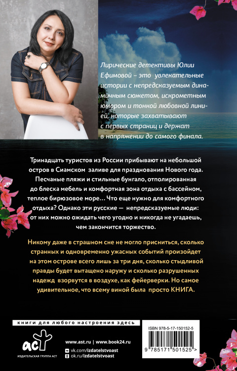 Тринадцать туристов из России прибывают на небольшой остров в Сиамском заливе для празднования Нового года. Песчаные пляжи и стильные бунгало, отполированная до блеска мебель и комфортная зона отдыха с бассейном, теплое бирюзовое море… Что еще нужно для комфортного отдыха? Однако эти русские - непредсказуемые люди: от них можно ожидать чего угодно и никогда не угадаешь, чем закончится торжество. Никому даже в страшном сне не могло присниться, сколько странных и одновременно ужасных событий произойдет на этом острове всего лишь за три дня, сколько стыдливой правды будет вытащено наружу и сколько разрушенных надежд взорвутся в воздухе, как фейерверки. Но самое удивительное, что всему виной была просто КНИГА.