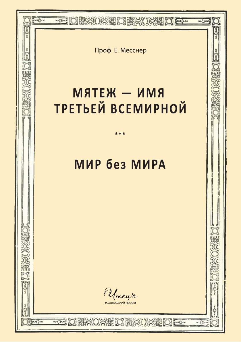 Сборник из двух книг известного теоретика военного дела в русской эмиграции, генерала Евгения Эдуардовича Месснера (1891-1974). Текст по изд.: - Мятеж - имя Третьей Всемирной. Буэнос-Айрес, 1960. - Мир без мира. Нью-Йорк, 1967.