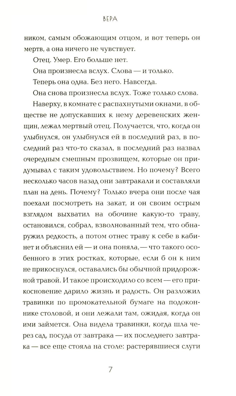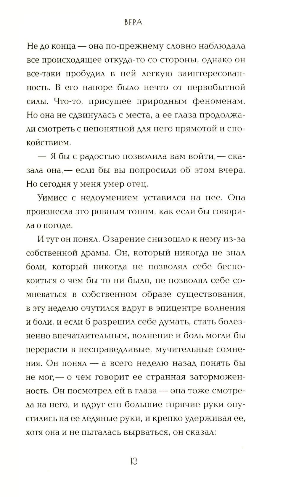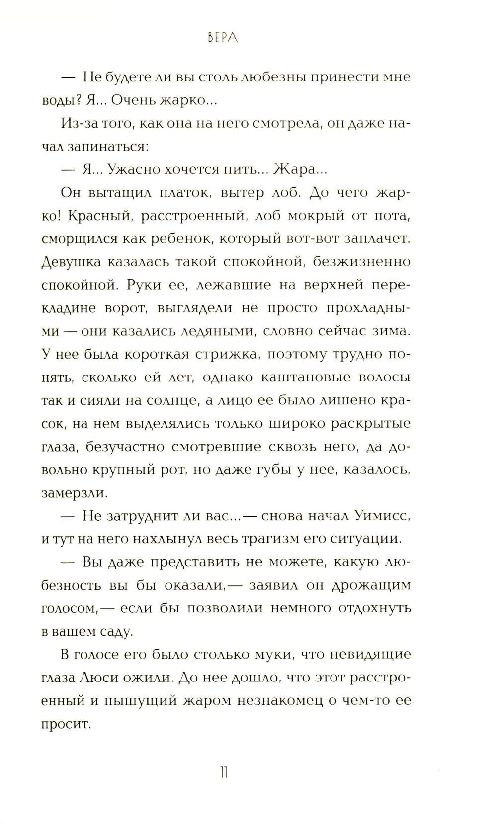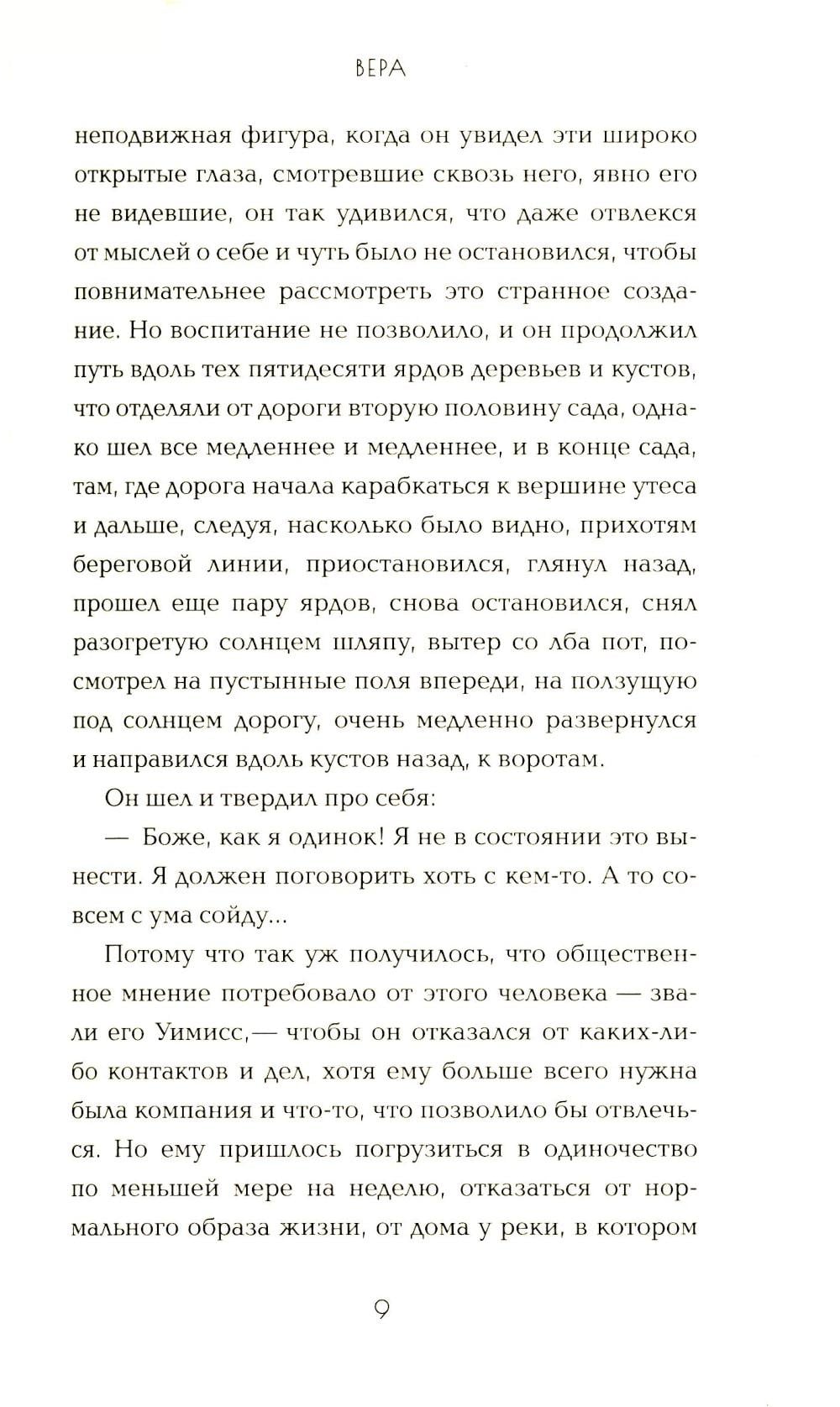 Создательница восхитительного «Колдовского апреля» Элизабет фон Арним называла «Веру» своим лучшим романом. Это драматичная и отчасти автобиографичная история о том, что любовь обманчива, и люди подчас не те, какими кажутся в дни романтических ухаживаний. Люси и Эверард недавно потеряли близких: она-любимого отца, он - жену, Веру. Нарастающая сердечная привязанность ведет героев к неминуемому браку. Но может ли брак быть счастливым, если женщина ослеплена любовью, а мужчина - эгоист, слушает только самого себя? И что же случилось с Верой, чья смерть стала внезапной для всех обитателей родового поместья? Роман увидел свет в 1921 году и тот час же читатели поставили его в один ряд с «Грозовым перевалом» Эмилии Бронте.