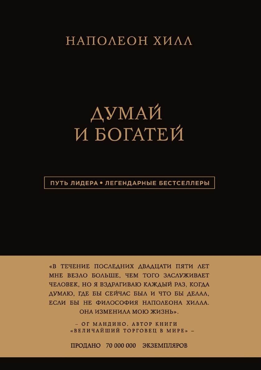 На протяжении уже почти 80 лет «Думай и богатей» является бестселлером по саморазвитию и самосовершенствованию - философия Наполеона Хилла выдержала проверку временем и не потеряла своей актуальности. Эту книгу должен прочитать каждый, кто стремится к личностному росту, финансовой независимости и хочет превратить свои идеи в деньги! Серия "Путь лидера. Легендарные бестселлеры» - это семь наиболее значимых в своей области книг о влиянии, управлении, стойкости, внутренней силе, богатстве, решительности и упорстве. Все авторы - признанные лидеры или лучшие эксперты по ключевым навыкам лидера. Эти бестселлеры уже имеют свою историю успеха и помогли миллионам людей добиться выдающихся результатов. Книги серии «Путь лидера. Легендарные бестселлеры» роскошно оформлены: переплет из черного бумвинила, тиснение золотом, скругленные углы, стильные красные форзацы и лента-ляссе, качественная белая бумага в блоке. Прекрасный подарок и украшение для книжной полки. Книга также выходит под названием «Думай и богатей».