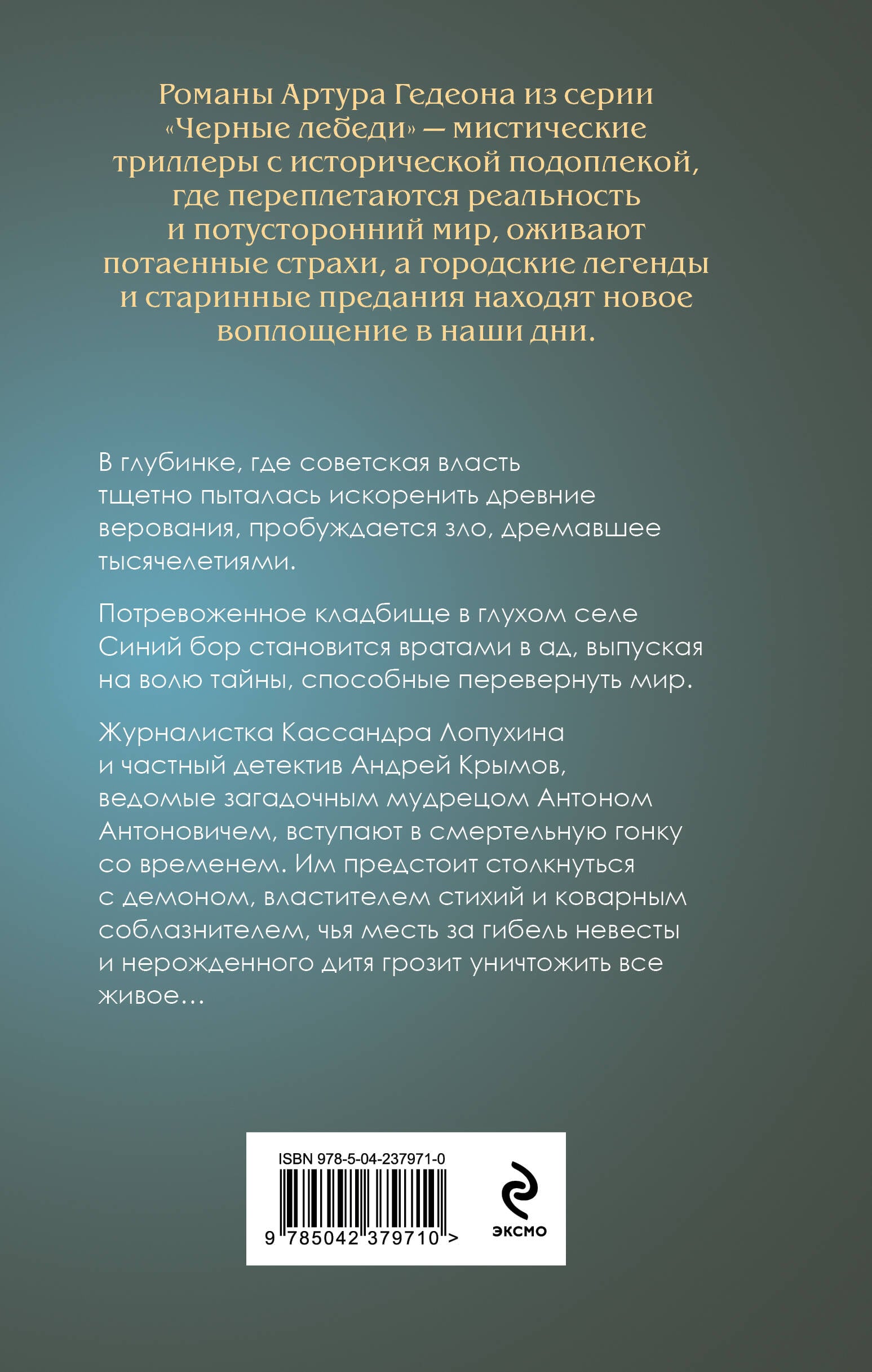 В глубинке, где советская власть тщетно пыталась искоренить древние верования, пробуждается зло, дремавшее тысячелетиями. Потревоженное кладбище в глухом селе Синий бор становится вратами в ад, выпуская на волю тайны, способные перевернуть мир. Журналистка Кассандрa Лопухина и частный детектив Андрей Крымов, ведомые загадочным мудрецом Антоном Антоновичем, вступают в смертельную гонку со временем. Им предстоит столкнуться с демоном, властителем стихий и коварным соблазнителем, чья месть за гибель невесты и нерожденного дитя грозит уничтожить все живое… Мистический триллер с элементами фолк-хоррора и детектива. В новом романе Артура Гедеона из цикла «Леший» переплетаются древние легенды, недавнее прошлое и современное расследование паранормальных явлений. Частный детектив и журналистка, изучая тайну советских времен, вступают в смертельную схватку с демоном стихий, вернувшимся, чтобы отомстить и забрать свое наследие.