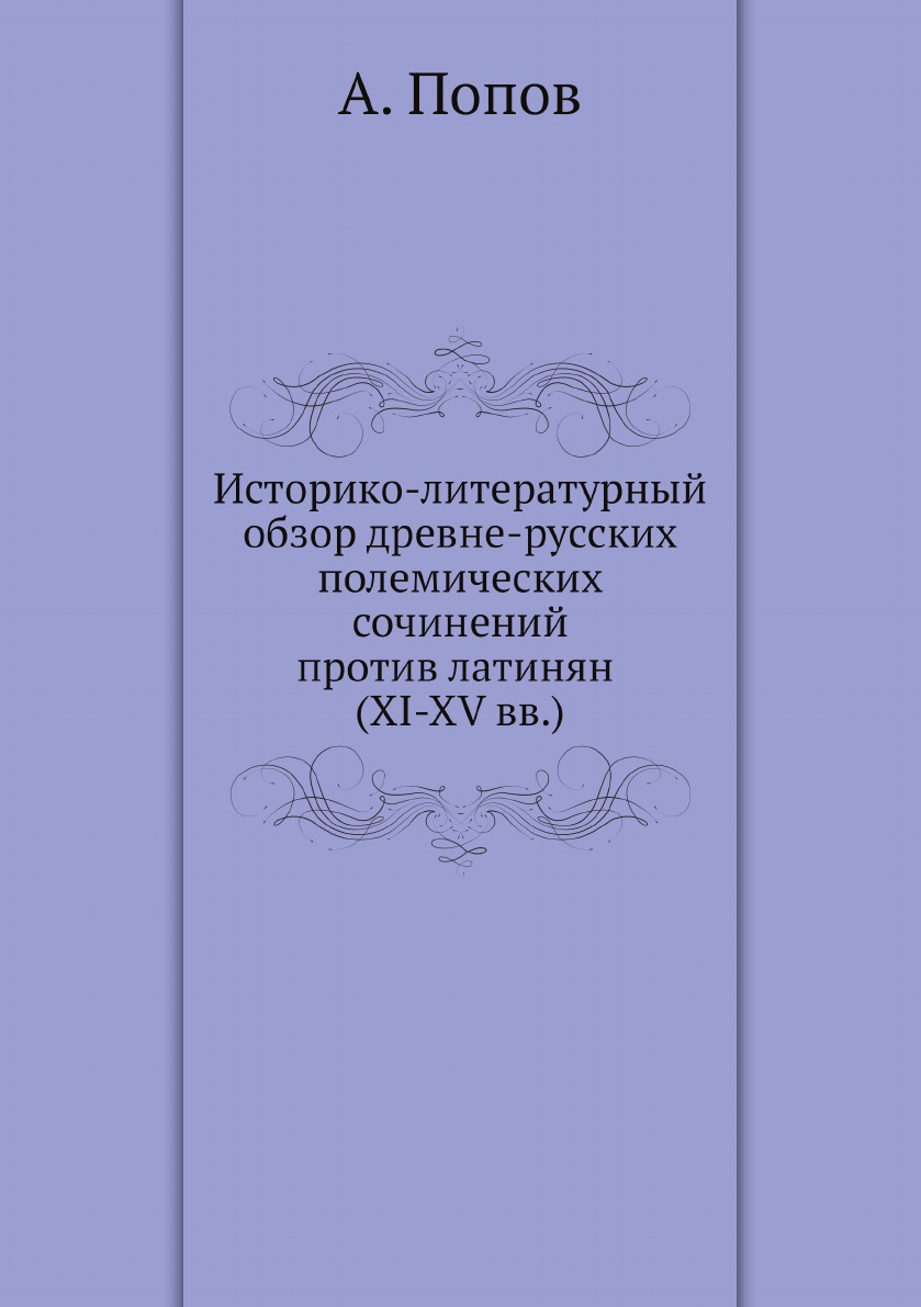 Эта книга - репринт оригинального издания (издательство "Типография Т.Рисъ", 1875 год), созданный на основе электронной копии высокого разрешения, которую очистили и обработали вручную, сохранив структуру и орфографию оригинального издания. Редкие, забытые и малоизвестные книги, изданные с петровских времен до наших дней, вновь доступны в виде печатных книг. ГЛАВА I. Летописнае статья о Латинах и ее отношение к Византийским полемическим сочинениям. Послание к Латинам Леонтия митрополита русского. Послание Константинопольского патриарха Михаила Керулария к Антиохийскому патриарху Петру. Статья Кормчей книги о Фрязех и о прочих Латинах. Слово св. Феодосия, игумена Киево-Печерского монастыря, о вире христианской и о латинской. Георгия, митрополита русского, стязание с Латиною. Иоанна II , митрополита русского, послание к папе Клименту III. Никифора, митрополита русского, полемические послания 1. ГЛАВА II. Полемические сочинения против Латинян, внесенные в древнейшие списки Кормчей книги. Полемические сочинения против Латинян, внесенные в Сербский требник нач. XV века. Старейшие сборники о Латинах. Прениe Панагиота с азимитом в сербской и русской редакциях. Тактикон Никона Черногорца. Сочинения Григория Паламы и Нила Кавасилы. Паноплия. Слово Григория митрополита 122. ГЛАВА III. Старейшие полемические русские сочинения, вызванные Флорентийским собором 326. Приложение 399. Указатель