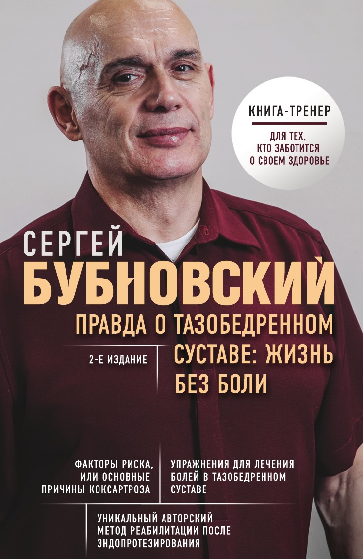 БУБНОВСКИЙ СЕРГЕЙ МИХАЙЛОВИЧ - доктор медицинских наук, профессор, автор принципиально новых безоперационных методов лечения позвоночника и суставов, создатель нового направления в медицине - кинезитерапии, в которой сам больной активно участвует в своем выздоровлении благодаря внутренним резервам и пониманию своего тела. Девиз автора: «Ни дня без упражнений!» Тазобедренный сустав является самым мощным в организме человека и испытывает большую нагрузку, поэтому и не удивительно, что проблемы этого сустава занимают 2-е место после болей в спине. Как только в суставе появляется боль, каждый шаг превращается в пытку, каждое движение становится мучительным испытанием. Нарушается походка, болит спина, колени, трудно вставать и ложиться - все это коксартроз - болезнь тазобедренного сустава, возникающая как у людей среднего и старшего возраста, так и у молодых людей после травм. Система упражнений для тех, кто решил изменить свое отношение к здоровью Разумный подход к восстановлению сустава Причины появления остеопороза Читателю предлагается ознакомиться с уникальным материалом автора, который сам перенес операцию по эндопротезированию и исследующего эту проблему более 30-ти лет. Доктор Бубновский предлагает опыт успешного выхода из этой тяжелой болезни на примере своего личного дневника. Книга будет интересна не только широкому кругу читателей, имеющим проблемы тазобедренного сустава, но и специалистам.