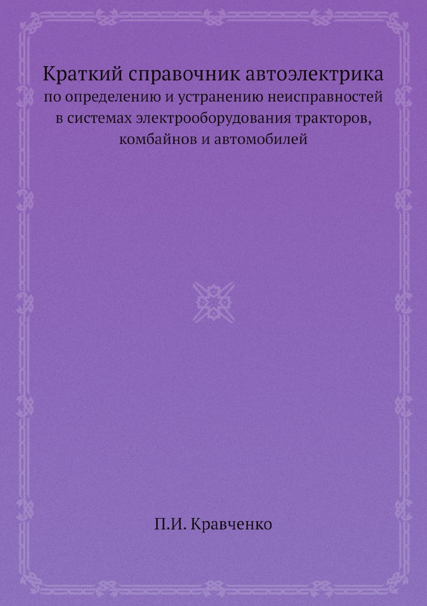 Эта книга - репринт оригинального издания (издательство "Урожай", 1967 год), созданный на основе электронной копии высокого разрешения, которую очистили и обработали вручную, сохранив структуру и орфографию оригинального издания. Редкие, забытые и малоизвестные книги, изданные с петровских времен до наших дней, вновь доступны в виде печатных книг. Приборы и агрегаты электрооборудования, устанавливаемые на отечественных автомобилях, тракторах, самоходных комбайнах и других машинах, прочны, надежны, долговечны. Однако в процессе эксплуатации происходит естественный износ деталей, истираются щетки и коллекторы генераторов и стартеров, окисляются клеммы и наконечники проводов, ослабевают пружины, обгорают контакты прерывателей и реле и т. д.В мастерских и на пунктах технического обслуживания машин имеется ряд приборов, с помощью которых можно легко и быстро обнаружить имеющуюся неисправность. Однако, если неисправность случилась в процессе работы, когда машина находится на значительном удалении от мастерских и пунктов технического обслуживания, водитель (шофер, тракторист, комбайнер) может обнаружить возникшую неисправность с помощью контрольной лампы или внимательным внешним осмотром. Поэтому каждый водитель должен хорошо владеть методикой обнаружения неисправностей в системе электрооборудования.В предлагаемом справочнике описаны наиболее часто встречающиеся неисправности в цепях зажигания, источников тока, пусковых устройств, освещения и сигнализации и указаны способы их обнаружения с помощью контрольной лампы. Одновременно дано краткое описание некоторых приборов системы электрооборудования.Приведены характеристики приборов и агрегатов автотракторного электрооборудования и даны развернутые схемы электрооборудования наиболее распространенных в народном' хозяйстве автомобилей, тракторов и зерновых самоходных комбайнов.Справочник предназначен для широкого круга сельских механизаторов.