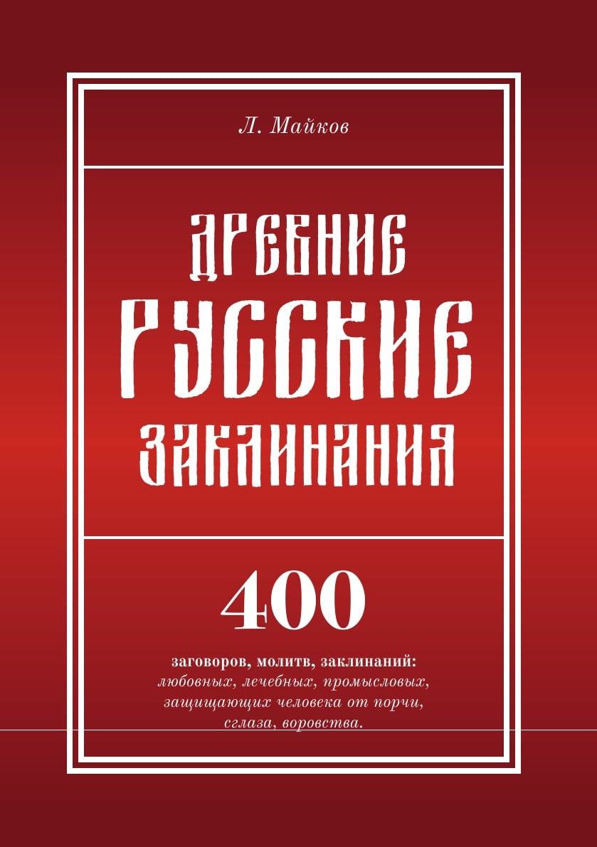 Книга «Древние русские заклинания. 400 заговоров, молитв, заклинаний: любовных, лечебных, промысловых, защищающих человека от порчи, сглаза, воровства» Леонида Николаевича Майкова - одно из первых и до сих пор наиболее полных собраний русских заговоров. В книге содержится около 400 заговоров, молитв, заклинаний: любовных, лечебных, промысловых, защищающих человека от порчи, сглаза, воровства и т.д.
