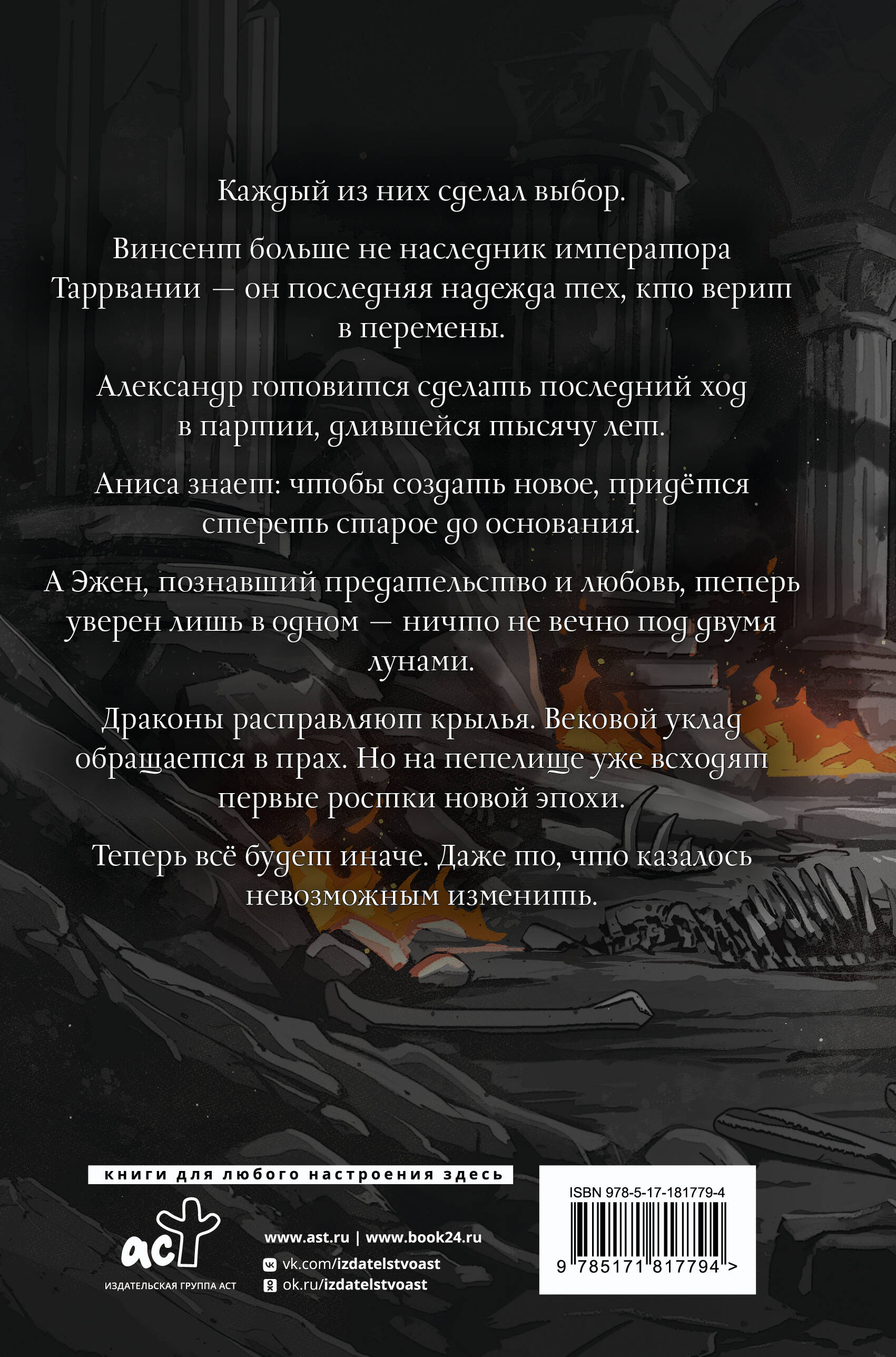 Каждый из них сделал выбор. Винсент больше не наследник императора Таррвании - он последняя надежда тех, кто верит в перемены. Александр готовится сделать последний ход в партии, длившейся тысячу лет. Аниса знает: чтобы создать новое, придется стереть старое до основания. А Эжен, познавший предательство и любовь, теперь уверен лишь в одном - ничто не вечно под двумя лунами. Драконы расправляют крылья. Вековой уклад обращается в прах. Но на пепелище уже всходят первые ростки новой эпохи. Теперь все будет иначе. Даже то, что казалось невозможным изменить.