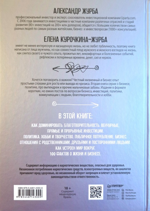 Елена Курочкина-Журба имеет не менее интересную и насыщенную жизнь, но не любит публичность, поэтому книга написана от лица мужчины, но как совместный плод мужского и женского взглядов на жизнь, как синтез своего и чужого опыта, прожитых лет, некомфортных и болезненных событий, рефлексии и потерянных времени, денег, сил и нервов.