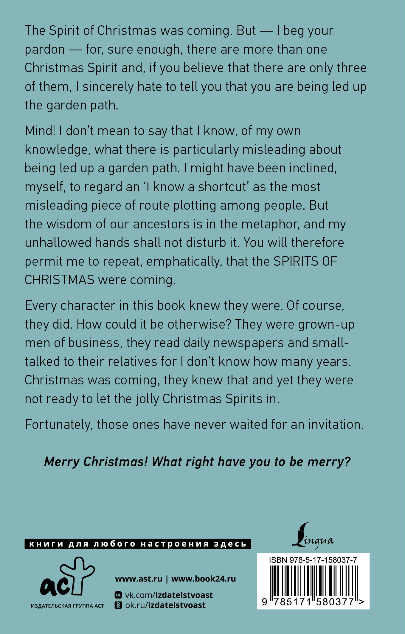 Рождество - время завернуться в плед, обнять руками теплую кружку и слушать, как завывает в окне студеный ветер. Слышите? Это раздраженное и ворчливое "Рождество - вздор!", которое доносит он из детства? Бой часов? Суровый и неумолимый голос духа Рождества? Звуки давно знакомые и вместе с тем подзабытые - не время ли вспомнить, что за историю они рассказывают? В этом сборнике вы найдете три знаменитые рождественские повести Чарльза Диккенса: "Рождественская песнь" - история Эбенизера Скруджа, главного скряги английской литературы, который ни в грош не ставил радость дружеского общения и праздничного тепла; "Колокола" - повесть о трудностях и злоключениях, на которые общество обрекает бедных, и о врожденном стремлении человека к идеалу; "Одержимый, или Сделка с призраком" - история о том, как важно помнить о страданиях, выпавших на нашу долю, но не позволять им захватить разум в кольцо сожалений. Насладитесь изысканным слогом и тонким юмором Чарльза Диккенса на языке оригинала без сокращений и адаптации!| Издательство | ИЗДАТЕЛЬСТВО "АСТ" |