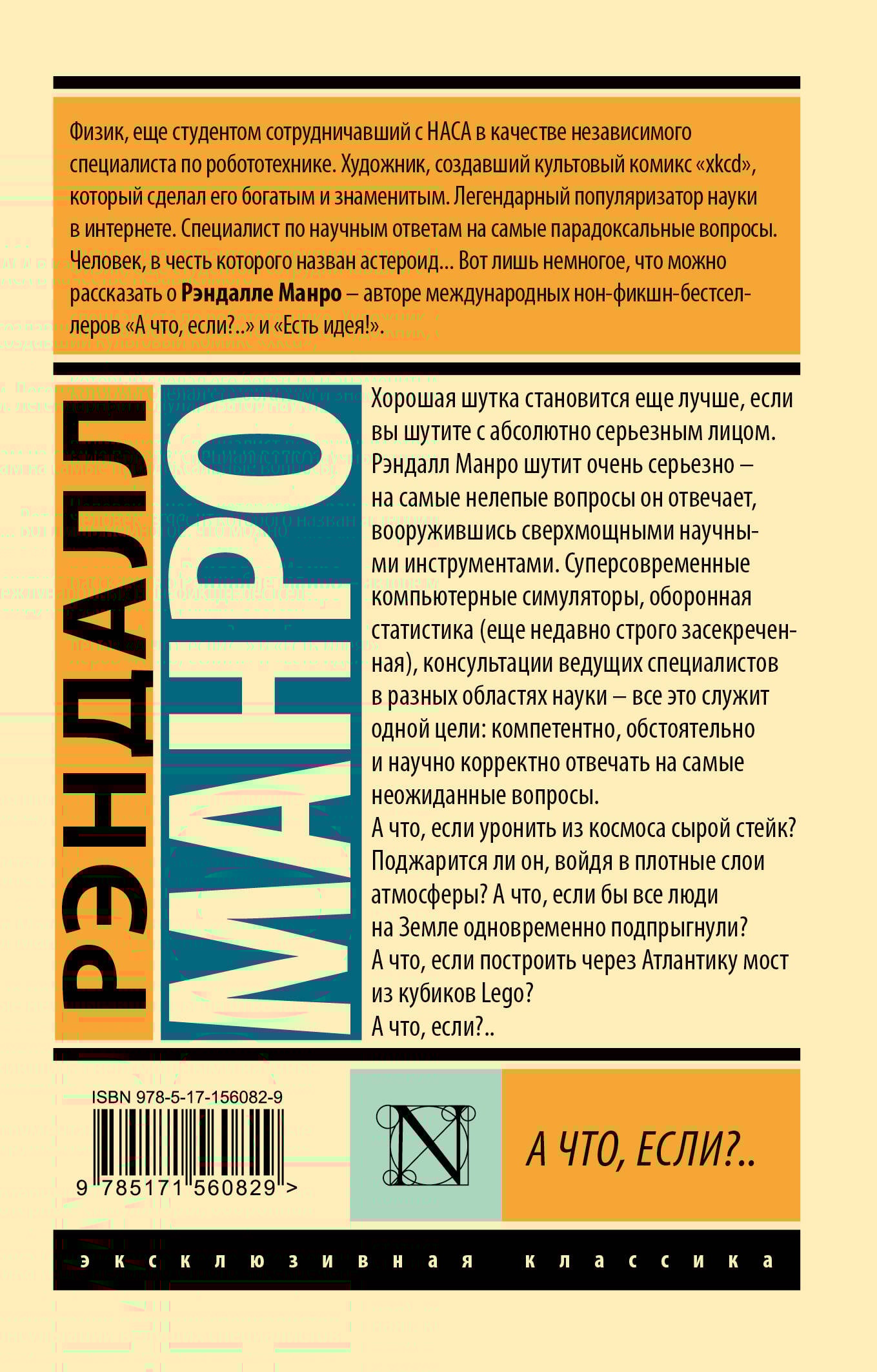 Хорошая шутка становится еще лучше, если вы шутите с абсолютно серьезным лицом. Рэндалл Манро шутит очень серьезно - на самые нелепые вопросы он отвечает, вооружившись сверхмощными научными инструментами. Суперсовременные компьютерные симуляторы, оборонная статистика (еще недавно строго засекреченная), консультации ведущих специалистов в разных областях науки - все это служит одной цели: компетентно, обстоятельно и научно корректно отвечать на самые неожиданные вопросы. А что, если уронить из космоса сырой стейк? Поджарится ли он, войдя в плотные слои атмосферы? А что, если бы все люди на Земле одновременно подпрыгнули? А что, если построить через Атлантику мост из кубиков Lego? А что, если?..| Издательство | ИЗДАТЕЛЬСТВО "АСТ" |