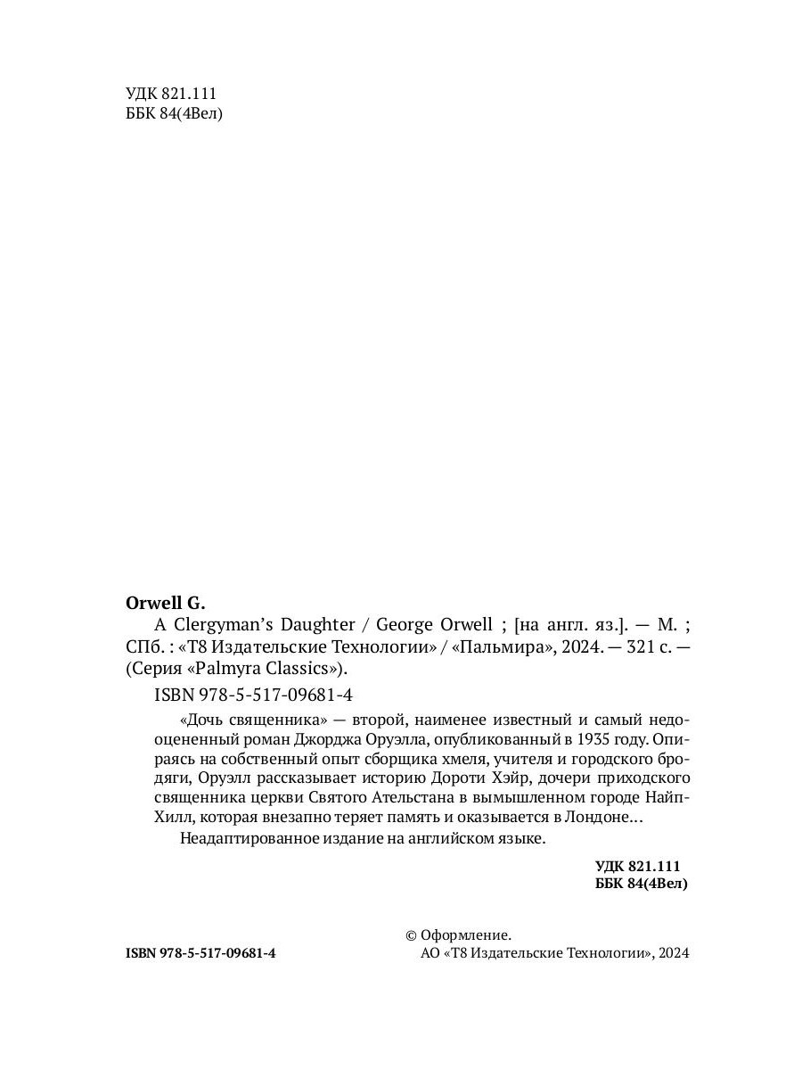 "Дочь священника" - второй, наименее известный и самый недооцененный роман Джорджа Оруэлла, опубликованный в 1935 году. Опираясь на собственный опыт сборщика хмеля, учителя и городского бродяги, Оруэлл рассказывает историю Дороти Хэйр, дочери приходского священника церкви Святого Ательстана в вымышленном городе НайпХилл, которая внезапно теряет память и оказывается в Лондоне… Неадаптированное издание на английском языке.